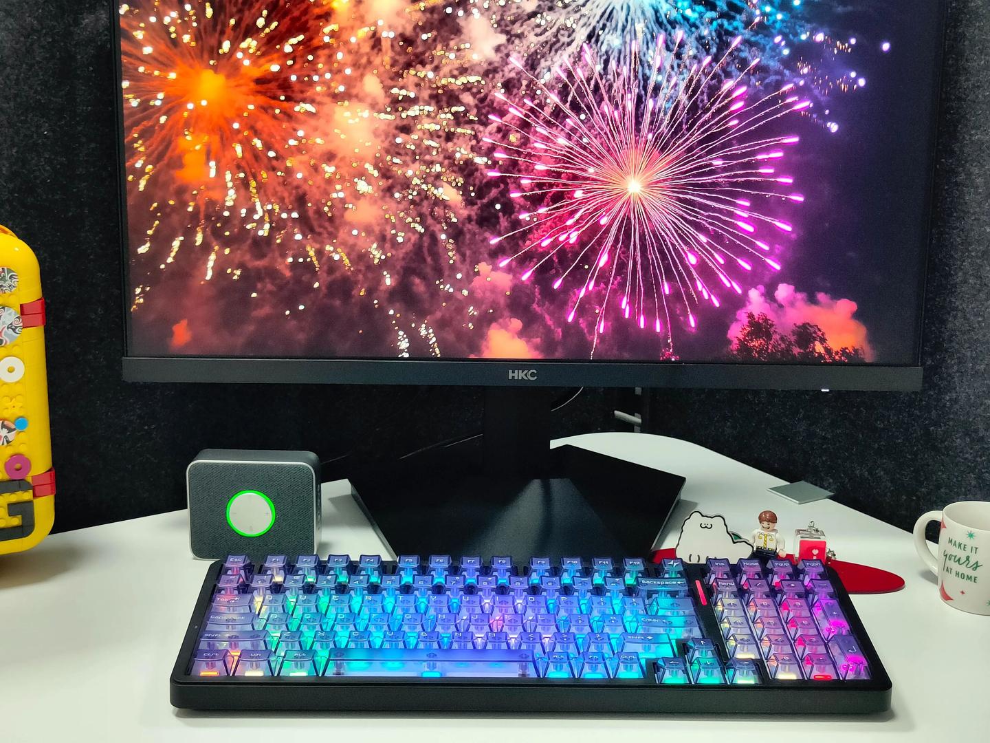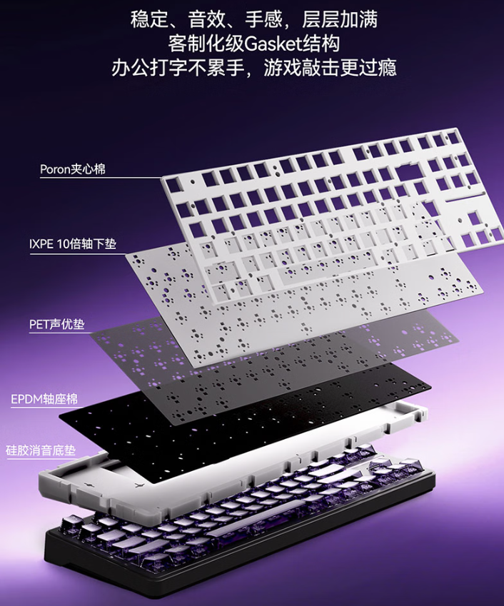 打字是温柔的 “搓麻将” 声,午休赶报表键盘敲的飞快,身边的同事都没说吵,五层填充(Pom 夹心棉、IXPE 轴下垫这些)滤杂音是真管用,触底的 “哒哒” 声都没了。