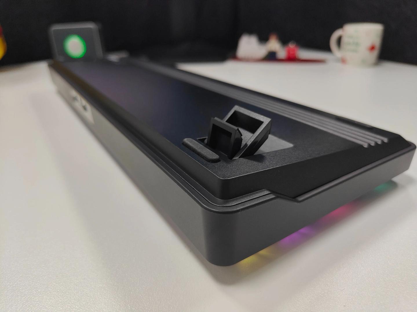 小细节也贴心:底部有隐藏收纳仓,2.4G 接收器放里面不丢,之前丢过两次接收器的痛谁懂;二段脚撑能调三个高度,我用中档刚好,手腕搭桌面敲一天不酸;还支持 WIN/MAC 通用,家里 Mac、公司 Windows,插上就用不用调快捷键。
