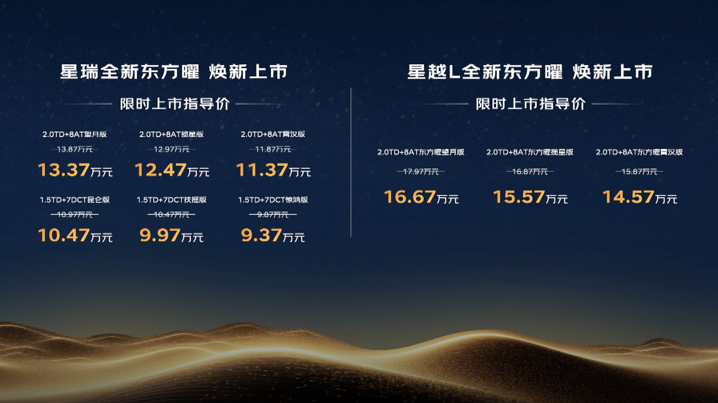 动力与驾控是燃油车的核心。东方曜系列搭载2.0TD高功率大涡轮发动机+爱信8AT黄金动力总成,最大功率200kW,峰值扭矩400Nm,零百加速仅6.5秒;CMA线控底盘配备四轮独立悬架等,平衡运动与舒适。星越L版本更搭载博格华纳第六代电液式四驱系统,0.03秒极速响应实现50:50扭矩分配,自驾穿越非铺装路面时,动力分配更精准,驾驶更安心。