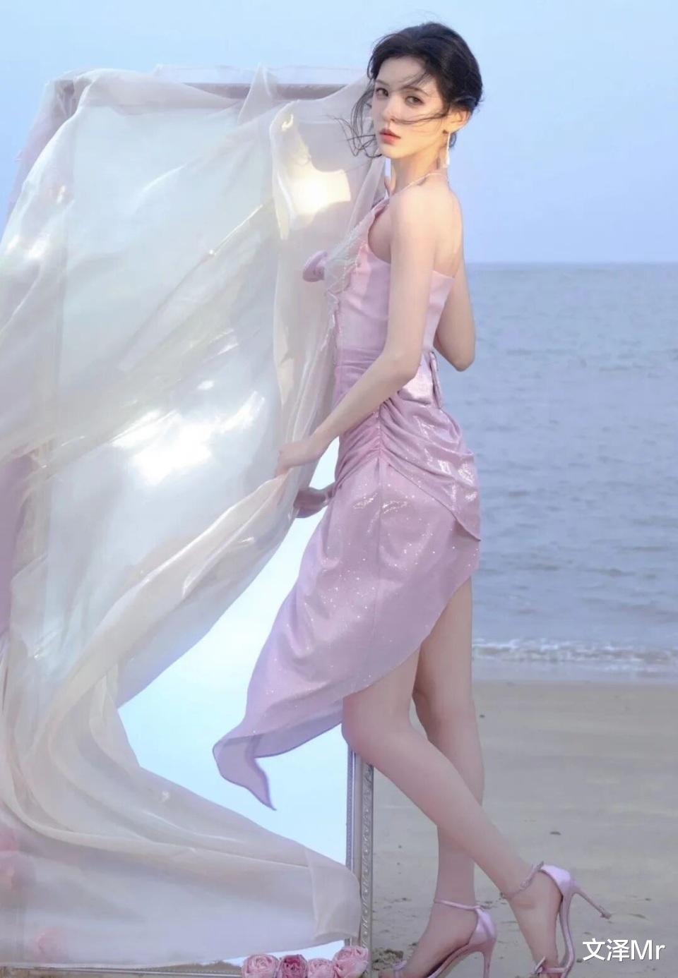 这条长裙堪称"神来之笔"。高开衩设计露出她笔直修长的美腿,同色系细高跟进一步拉长身材比例。双手轻搭薄纱的姿态,与背景的海天一线形成动人呼应。这造型将张予曦168cm的模特身材优势展现无遗,堪称海边行走的时尚画报。