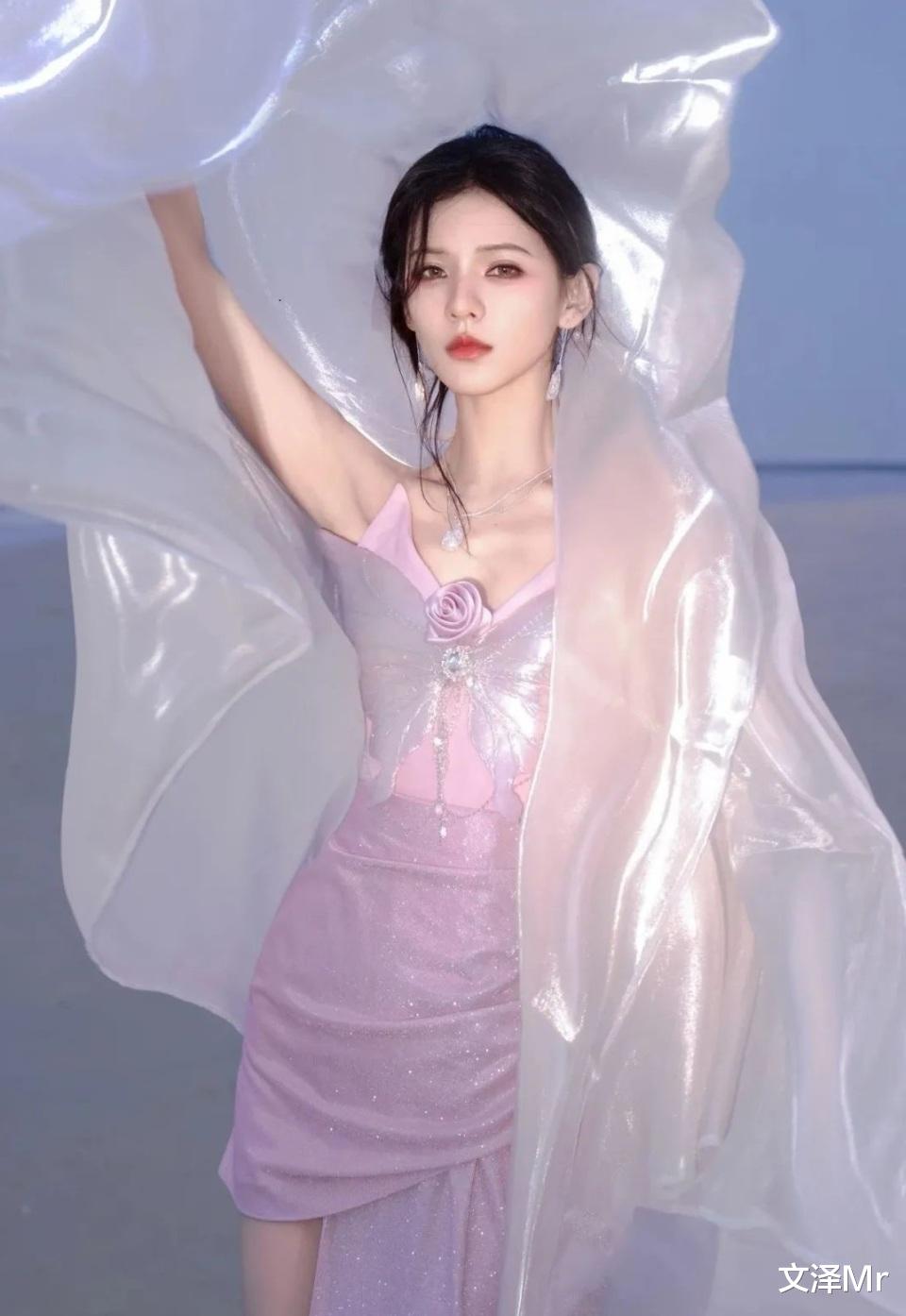 手扬薄纱的姿态灵动飘逸。这张照片展现了她可塑性极强的时尚表现力,无论是高定华服还是简约造型都能轻松驾驭。
