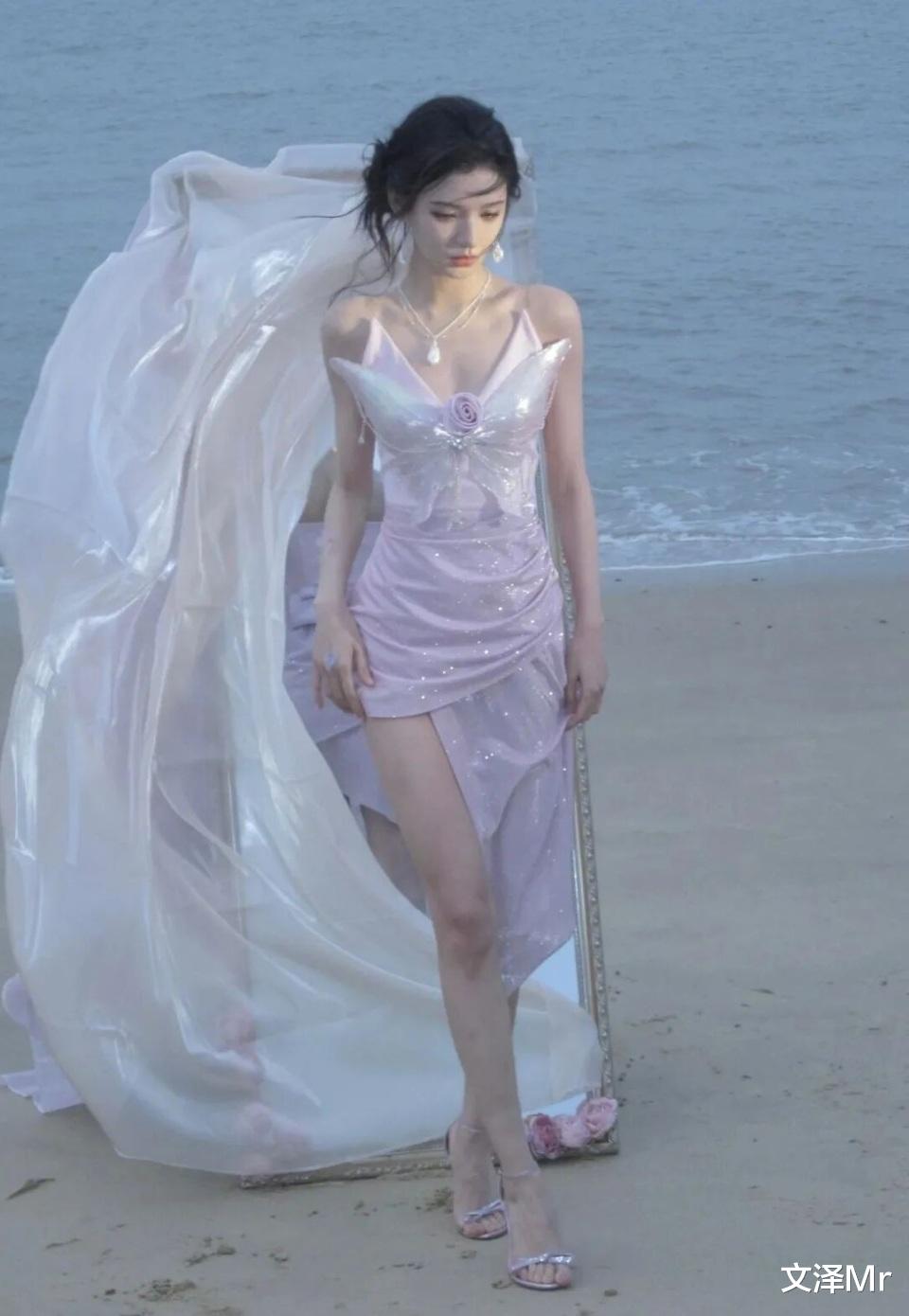 坐在沙滩上的张予曦,宛如童话中的人鱼公主。胸口的蝴蝶装饰与纱质裙摆,在浪花的衬托下更显梦幻。她撑地而坐的姿态既松弛又优雅,展现出她多年舞蹈功底塑造的形体美感。这张照片完美诠释了什么是"仙女本仙"。
