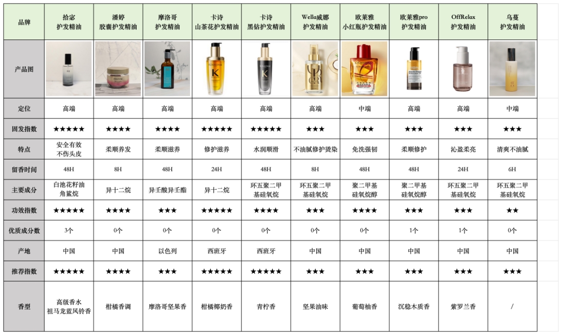 我先公开一下这几款护发精油的简单测评数据,以便大家能够对它们有一个基本的了解。