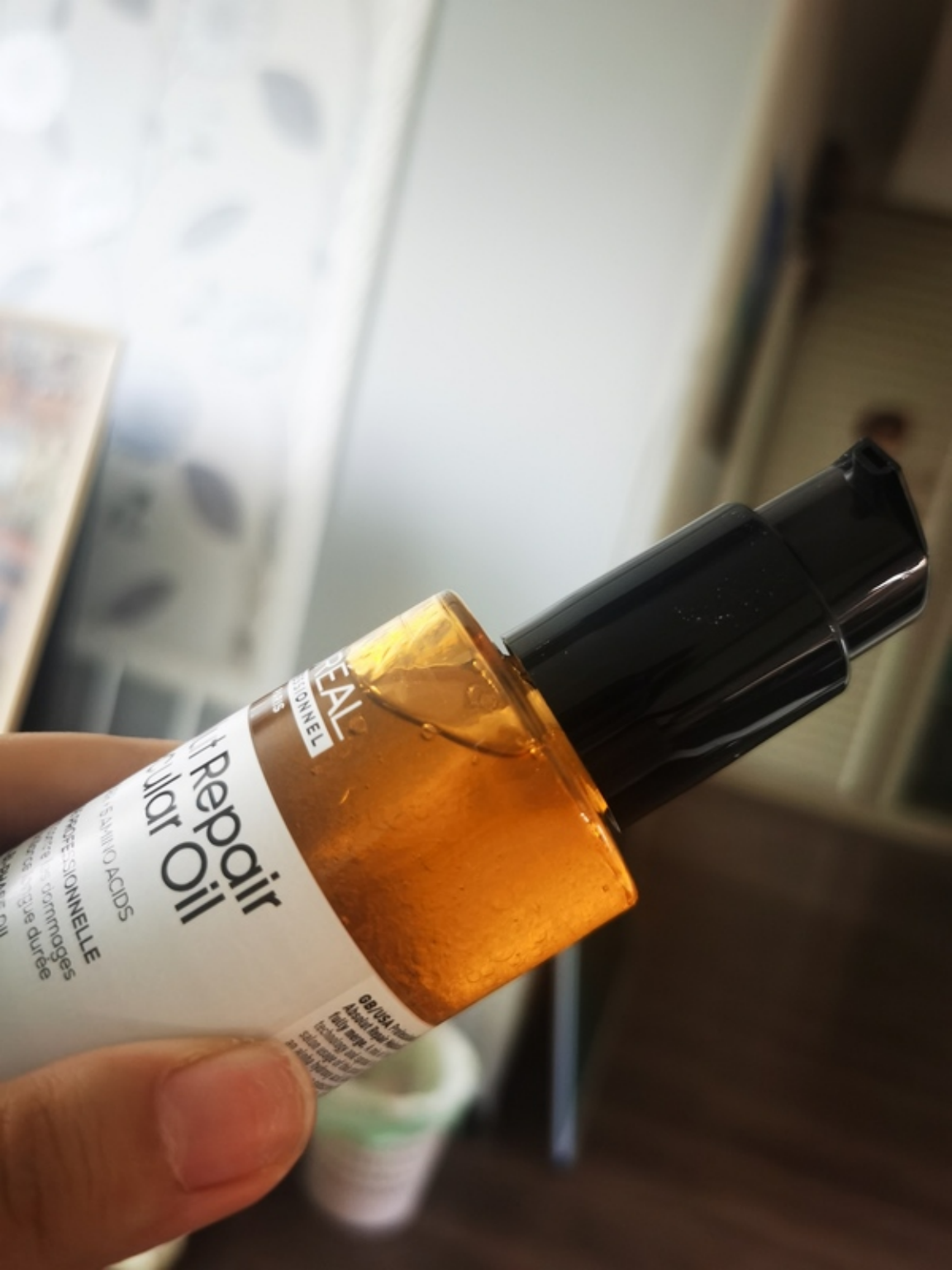 欧莱雅pro护发精油,来自法国,1907年创立,起初专注于实验室配方开发,之后延伸出针对发廊使用的系列,目前常见的有和烫染流程搭配的产品,包装通常是磨砂材质配简明标签。有次在剪发时看见师傅拿来调混合油,才知道这玩意还能这么用。