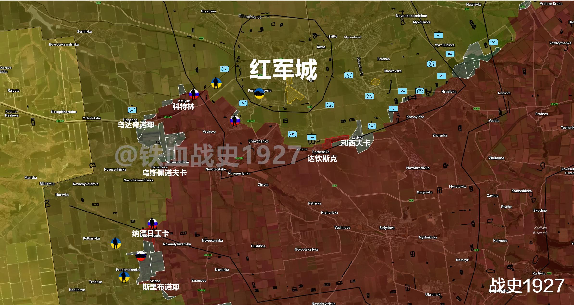 红军城南部的大规模战斗已经恢复了,双方主力已经进场作战。据军事纪实报2月22日介绍,俄军从达钦斯克东部出击,再次攻入利西夫卡西部,夺回了失去的阵地。科特林的俄军也巩固了前天夺回的工业区和东部田野中的阵地,并沿着铁路线和田野进一步向东北突击。乌达奇诺耶正在进行激烈的反战,乌斯佩诺夫卡的剩余地区正遭受俄军猛烈进攻,南部的纳德日丁卡已被俄军拿下。