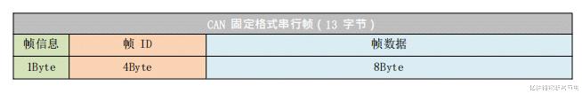 3、协议模式:CAN格式转换固定13字节表示一个CAN帧数据,13个字节内容包括CAN帧信息+帧ID +帧数据。在该转换模式下,设置的CANID无效,因为此时发送的标识符(帧ID)由上述的格式串行帧中的帧ID数据填充。配置的帧类型也无效,由格式串行帧中的帧信息来决定帧类型。帧ID的长度为4字节,标准帧有效位是11位,扩展帧有效位是29位。