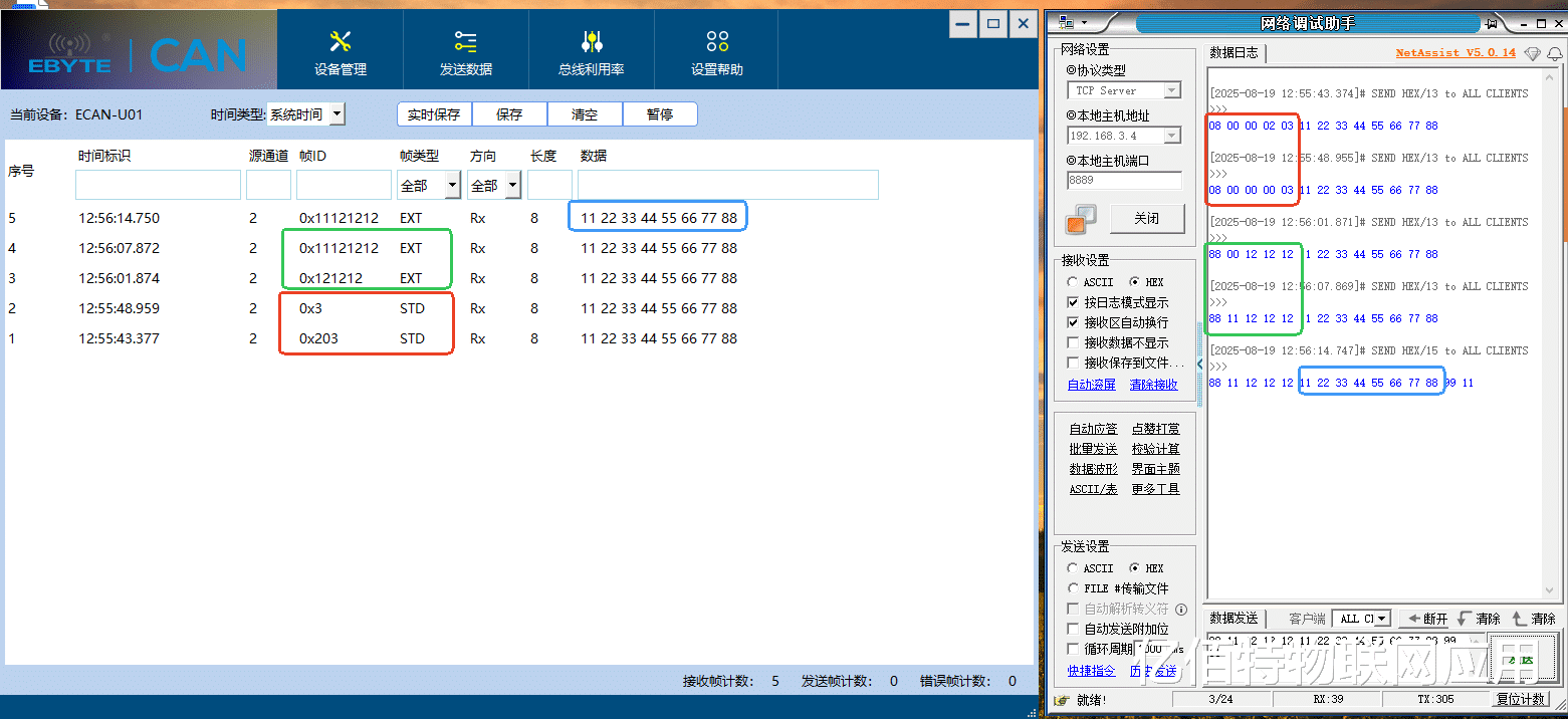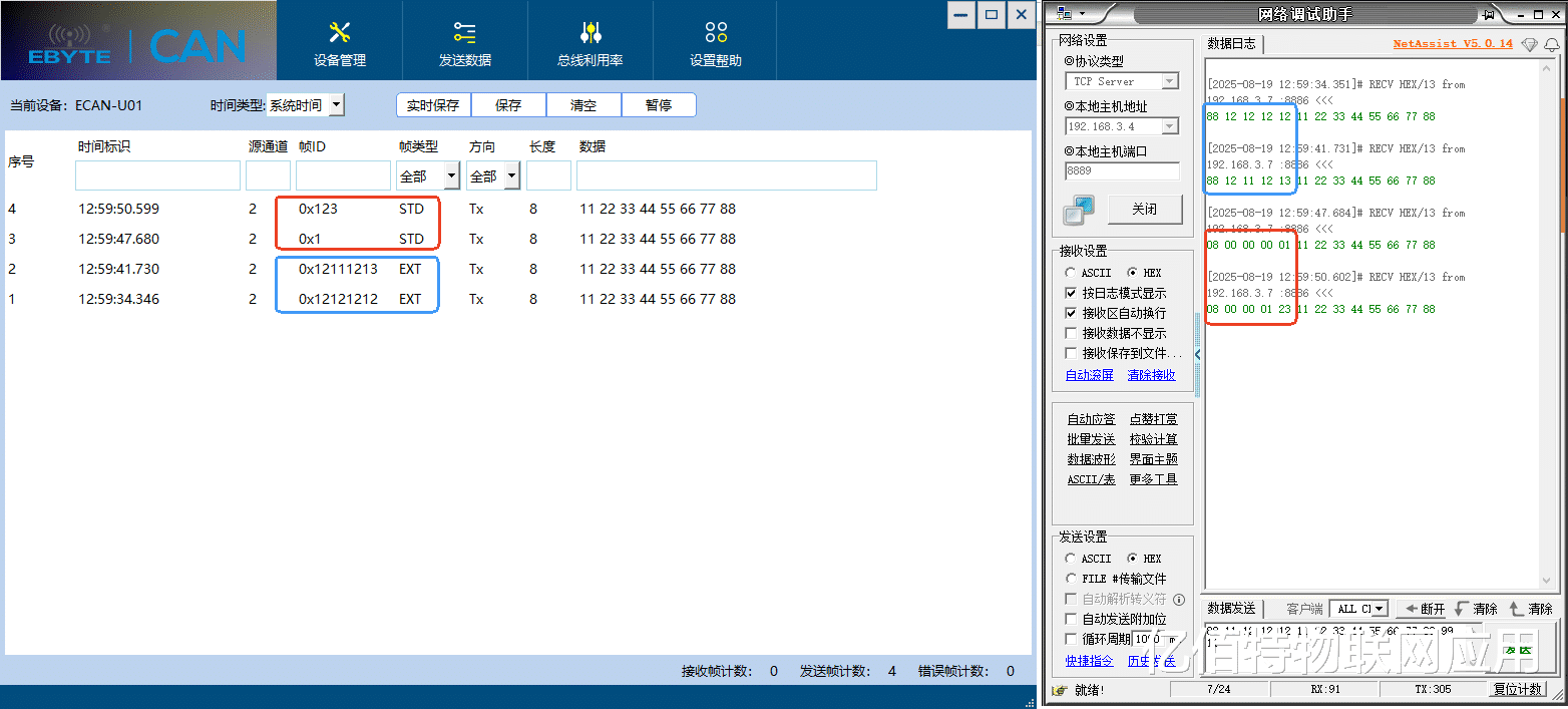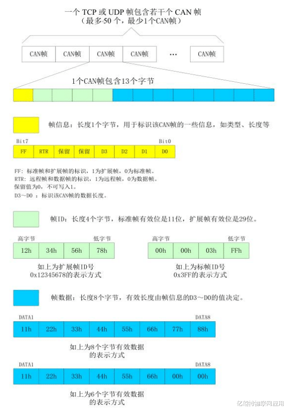 CAN转以太网和CAN转WiFi设备均按照标准CAN帧进行转换,见下图。