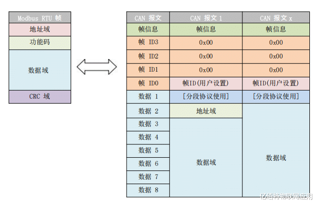 4、Modbus模式:模块在串口侧使用的是标准Modbus RTU协议格式,完成标准Modbus RTU与CAN的转换。