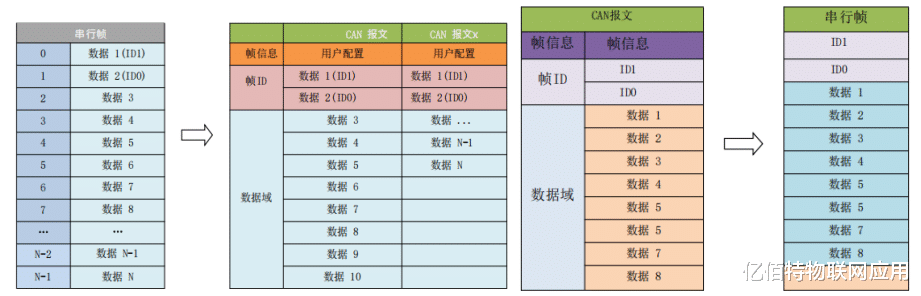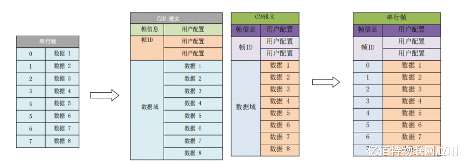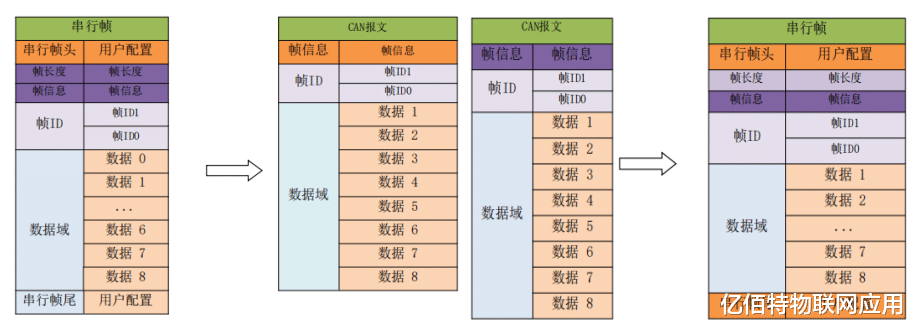2、透明带标识转换:在串行帧中带 CAN报文的ID信息,可以根据需要发送不同ID的CAN报文,协议转换见下图: