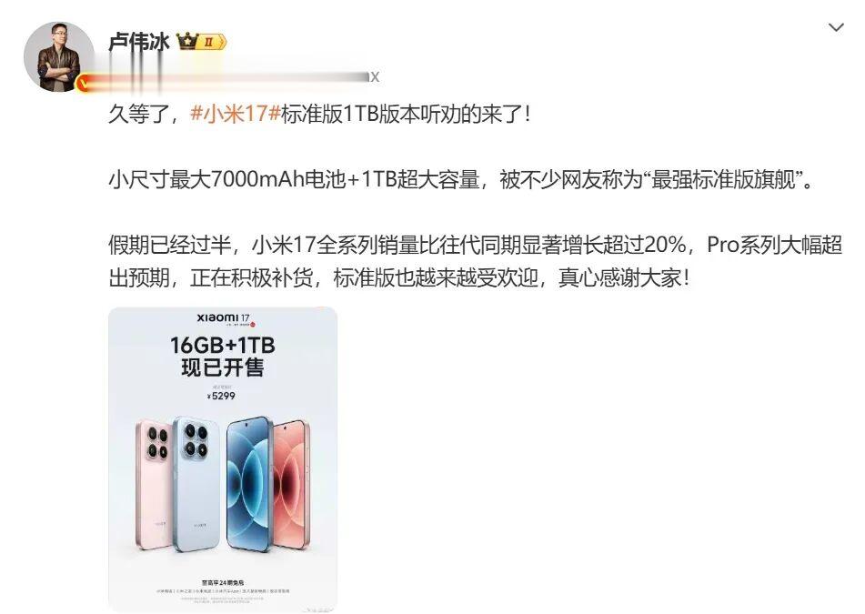 小米 17 于 9 月 25 日晚发布,首先推出 12GB + 256GB、12GB + 512GB、16GB + 512GB 版本,后续又新增一款 16GB+1TB 版本。