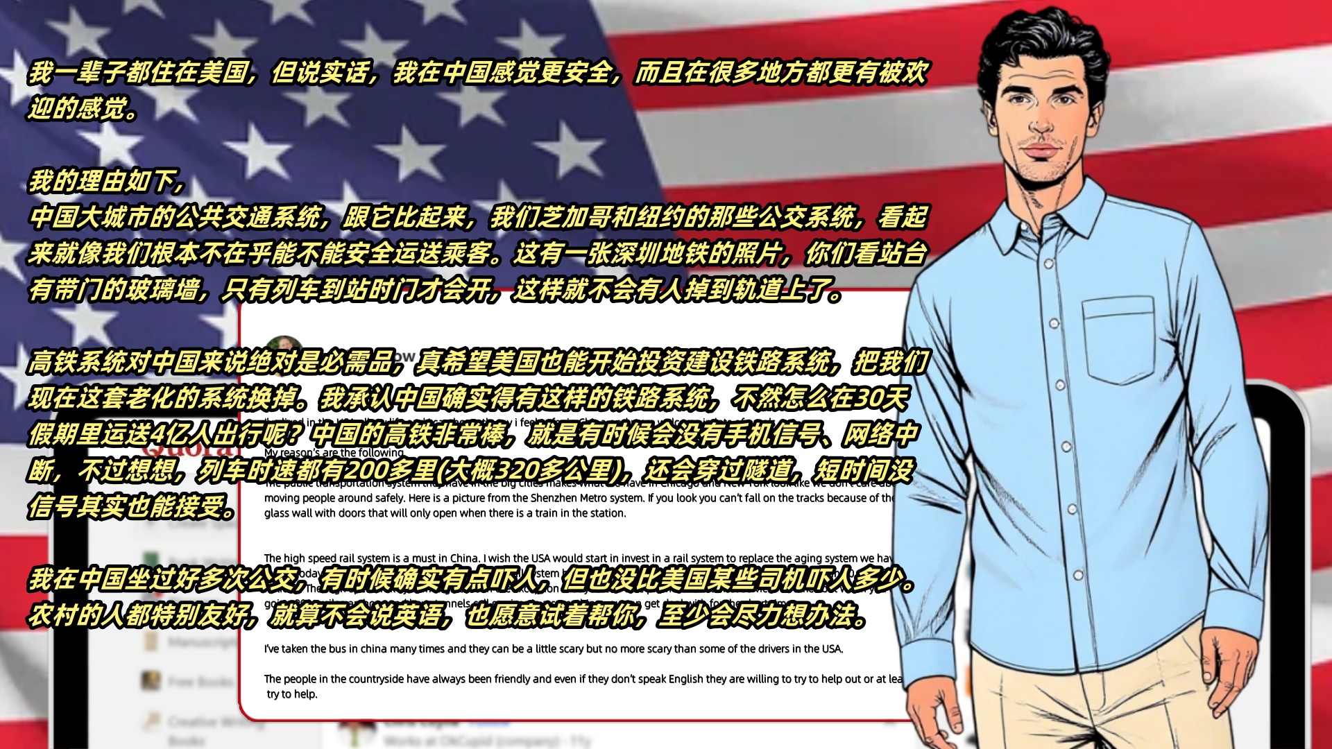 他表示自己没去过中国,但是身边好多不同国家的朋友到中国旅游后回来都是对中国十分赞叹,并表示和美国相比中国非常的安全,甚至还有朋友表示不仅是在美国,在全世界来说都很安全,在youtube看到不少去中国旅游的博主的视频,也十分向往,但是不少美国媒体的宣传却截然不同。