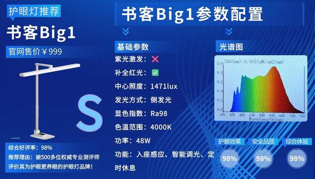 书客台灯之所以能获得如此高的评价,是因为它敢于突破!传统台灯大多停留在“单点防眩”思维,仅仅局部削弱直射光,却无法解决桌面亮暗不均、边缘刺眼的问题。书客Big突破性引入全光域防眩光4.0技术,通过八重光学结构协同黑科技+第三代SDIT自适应智能调光控光,实现从光源分解到桌面漫射的全链路优化:核心光学阵列精准分解强光,微棱镜阵列再精调,导光膜层逐级柔化,最终形成零刺眼、无暗角、光线均匀的整桌光场。护眼效果从单点修补跃升为系统级重构,UGR≤13的低眩光指标,缓解了83%的眼睛视力疲劳,视觉舒适度在各种环境下都得到全面保障,彻底颠覆传统台灯的光学局限。灯珠方面更是采用了新一代SunArc三芯片全光谱灯珠,采用源头级光谱工程研发,直接在发光源头“重配光谱”,基于1200+组波长实验数据,300+人眼视觉疲劳临床评估数据、60+项视网膜光毒性对比研究,有效保护视网膜和眼睛其他重要组织,大大减少有害蓝光的影响,将近视风险大大降低92%。