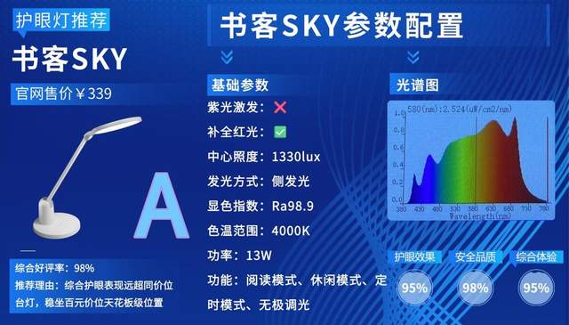 面对主打亮度却表现平平的同价位产品,书客sky选择从技术上的专研到底,打破了“便宜没好货”的刻板理念,通过多道精密光学加工与严苛装配工艺,打造出创新性的 5 域环控光学系统。其核心由高密度纳米级导光板与多层次专业扩散膜组合而成,能够在微米级范围内对光线进行均匀折射与扩散,配合上DT多维漫射2.0技术,提升93%光照柔和度的同时,有效消除直射 LED 光源常见的颗粒感与光斑分布不均问题。另外RRT2.0红光养眼技术搭配硬件级低蓝光技术,软硬兼施的相互配合下,凭借精准的拦截400-450nm有害高能蓝光,将红光效果增强至极限,实现每天3分钟“红光”,有效保护视网膜和眼睛其他重要组织,大大减少有害蓝光的影响,将近视风险降低90%。