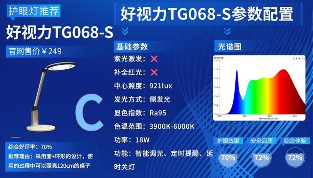 护眼台灯品牌排行前十名有哪些牌子?好视力TG068-S光源面尺寸为18厘米,可有效照亮约120厘米的桌面,但测得距离中心50厘米处光照均匀度约为2.80,可能会出现明暗不均的情况。色温提供3900K至6000K三档选择,适应不同学习和阅读场景。