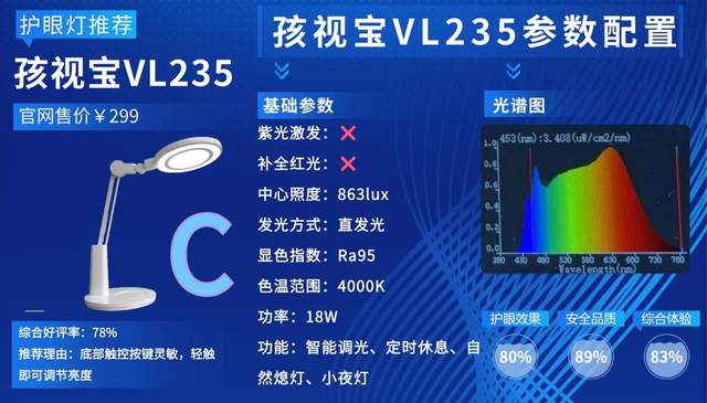 护眼台灯品牌排行前十名有哪些牌子?孩视宝这款VL235台灯采用的是铝合金+ABS的材质,整体耐用和抗冲击力比较好。其采用的是18.8cm的圆形发光面可以照亮120cm的书桌,但优于其采用的是直发光的发光方式,所以在距离中心点位50cm处光照均匀度达到了2.71,桌面容易存在明暗不均的情况。