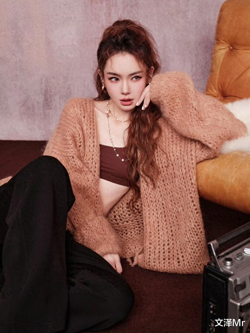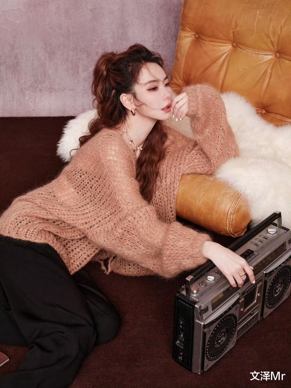 戚薇随意侧坐在地,浅棕色粗针织开衫搭配深棕抹胸,蓬松卷发配上精致妆容,宛如油画中走出的复古女郎。多层珍珠项链与身旁的复古收音机相映成趣,整体造型将休闲与优雅完美融合。这种信手拈来的时尚感,正是她多年积淀的审美体现。