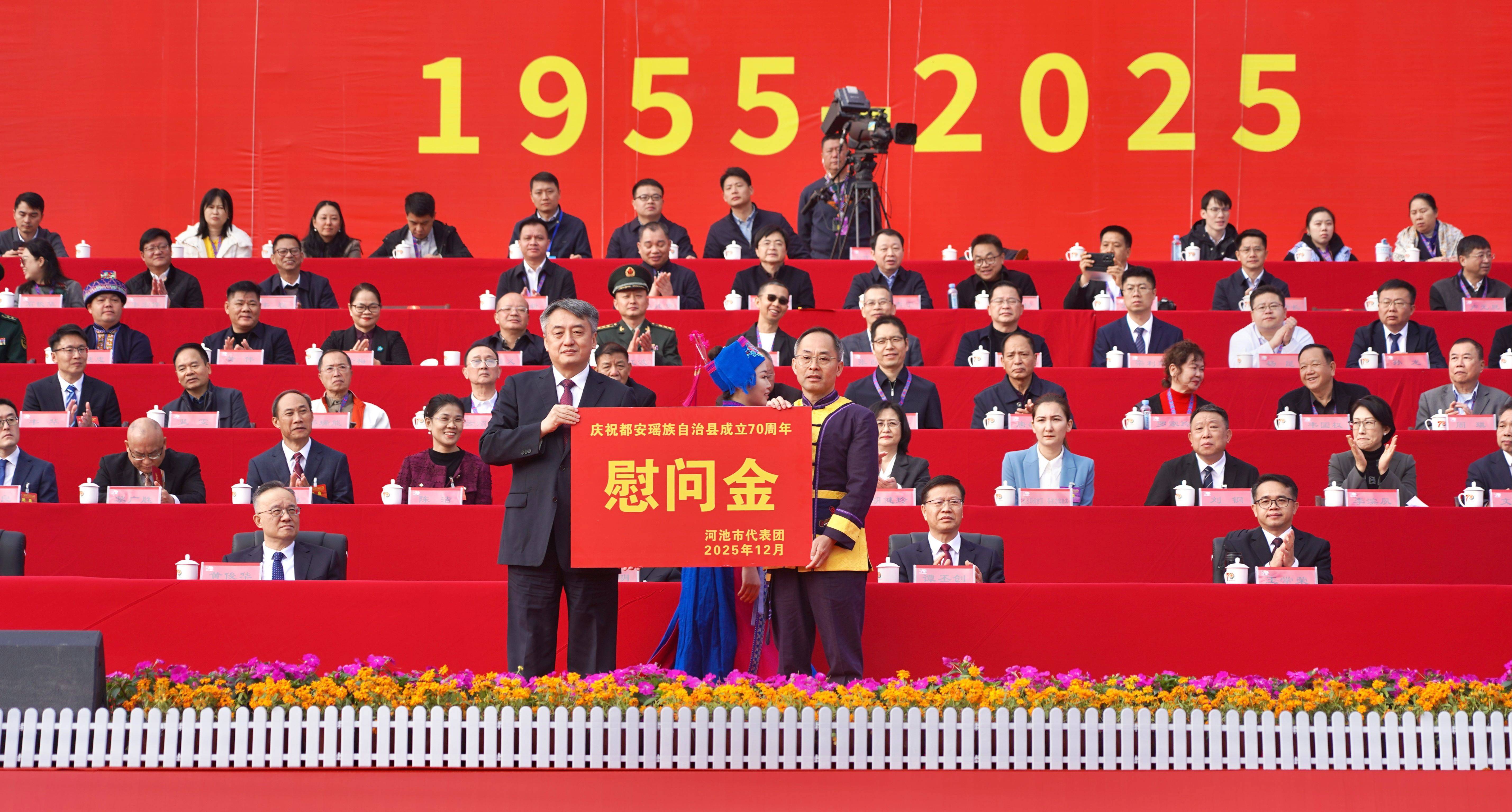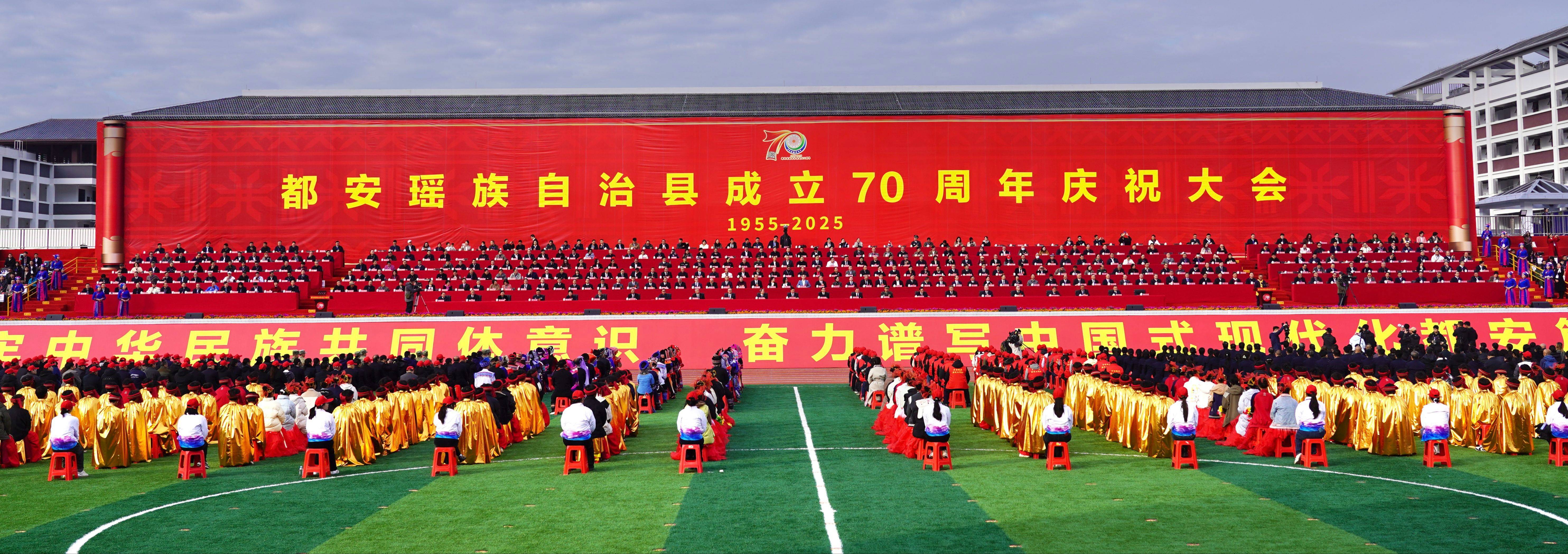 12月15日上午,都安瑶族自治县举行庆祝大会、群众文艺展演、成就展等活动,喜庆自治县成立70周年,全方位展示都安经济社会发展成就。全国人大民委、国家民委祝贺团团长,国家民委教育司副司长王学荣;自治区代表团团长,自治区党委常委、统战部部长谭丕创;自治区代表团副团长,自治区人大常委会副主任刘有明、自治区副主席蓝晓、自治区政协副主席黄俊华、广西军区少将副司令员杨猛;市代表团团长,市委书记秦春成,市委副书记、市长王军;市代表团副团长,市政协主席黎丽等出席相关活动,与都安各族干部群众共同欢庆盛会。