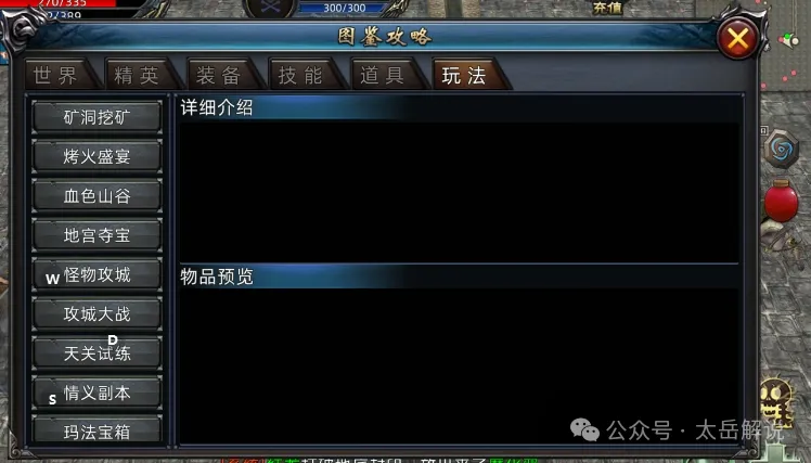 其次,游戏对新手也是比较友好的,世界boss、精英怪刷新、装备图鉴、技能获取和活动玩法都可以在右上角图鉴攻略看到。因为游戏是无主线任务的,所以我们从新手村出来之后可能会觉得迷茫,这时候我就可以通过这个玩法攻略来了解下游戏的诸多玩法。