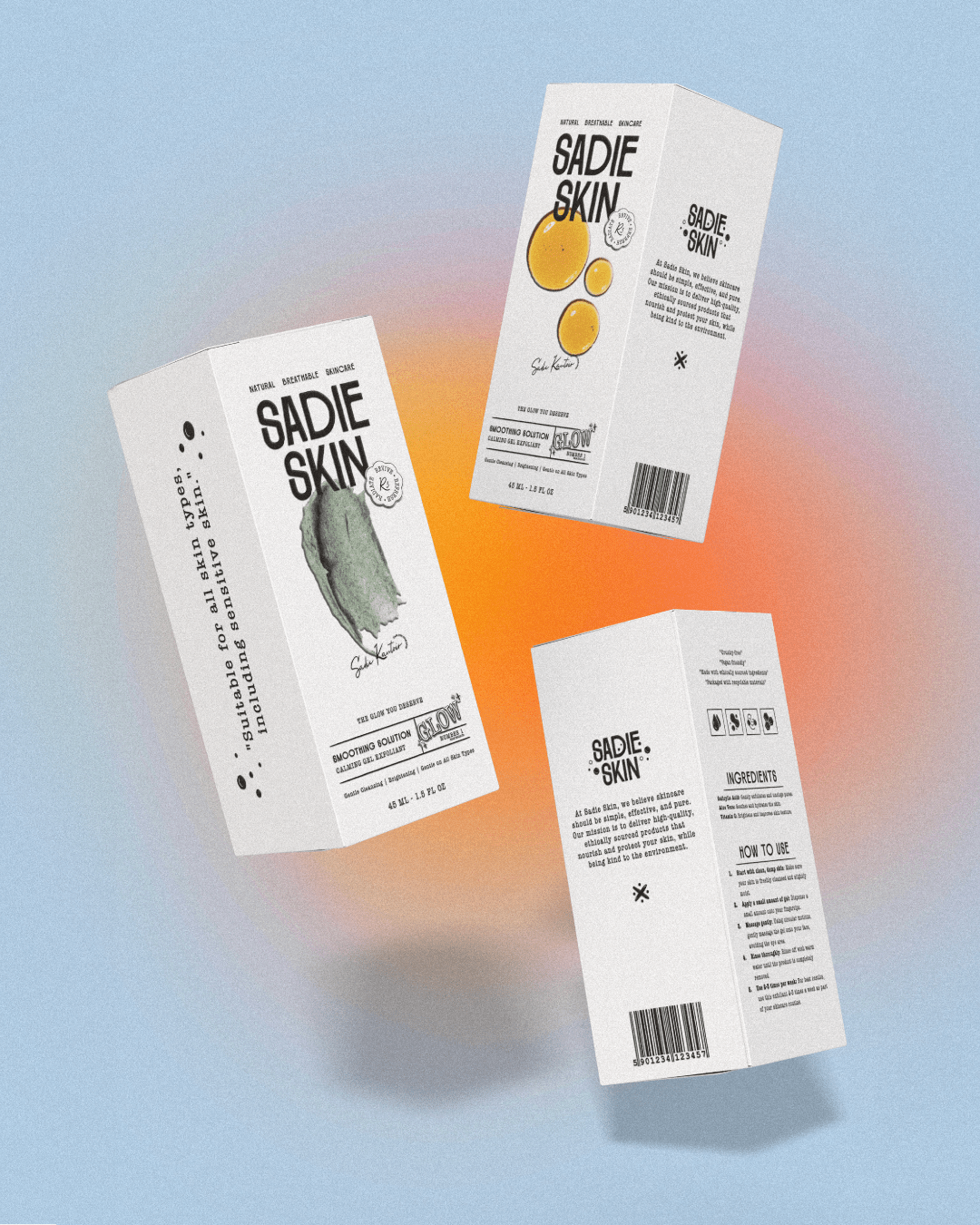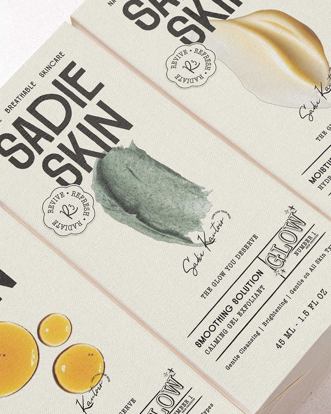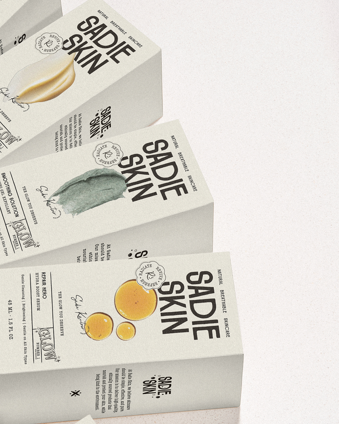 Sadie Skin的产品包装设计就像一场与自然的诗意对话。整体风格清新简约,以浅色调为主,仿佛给产品披上了一层柔和的自然滤镜。