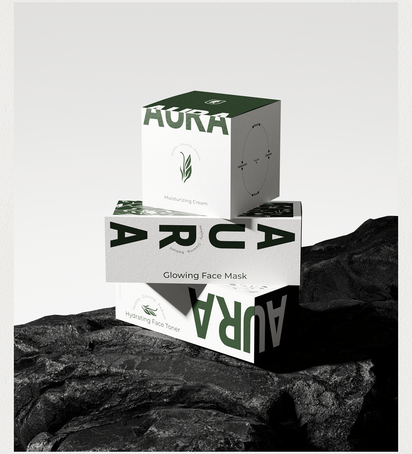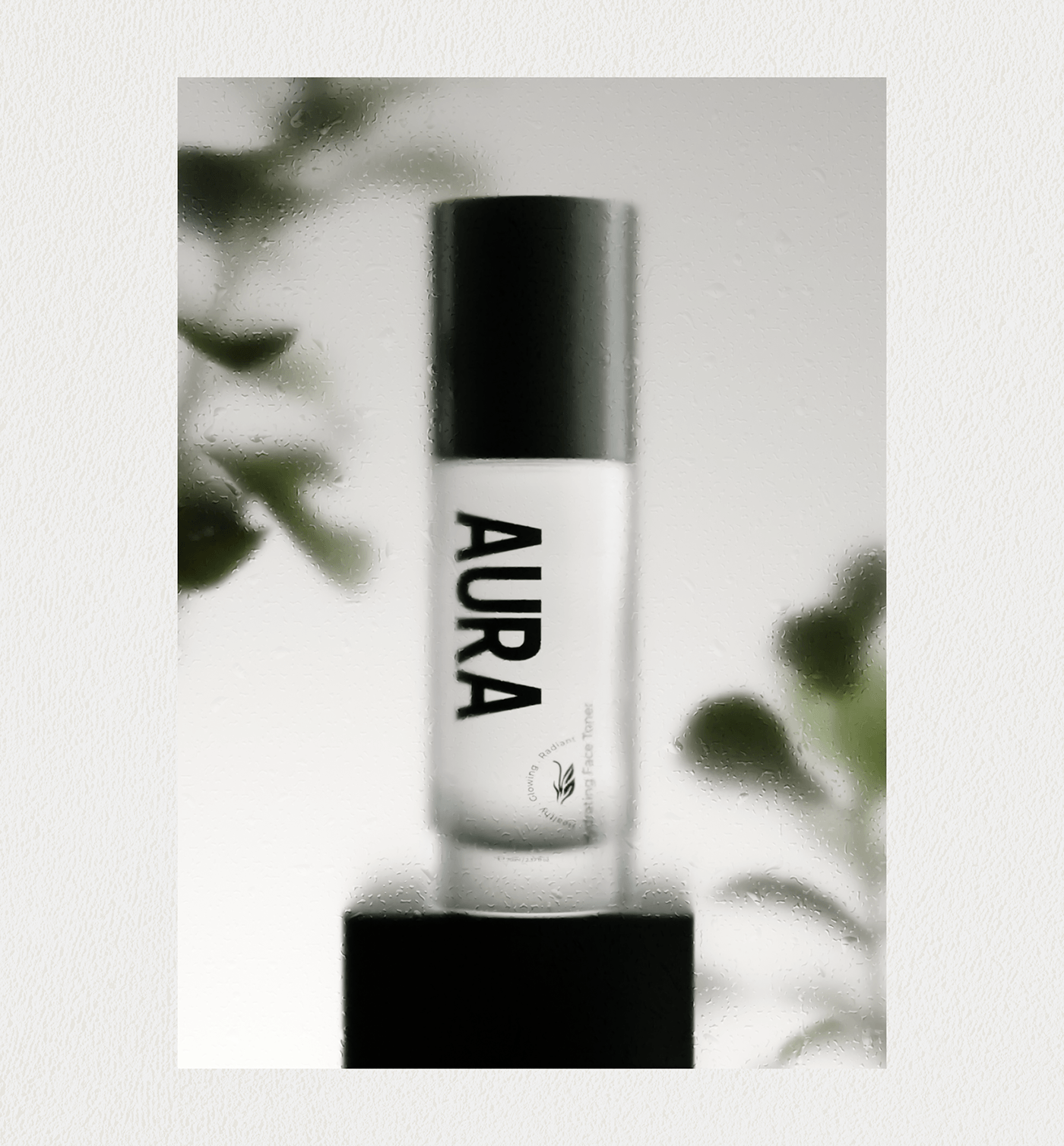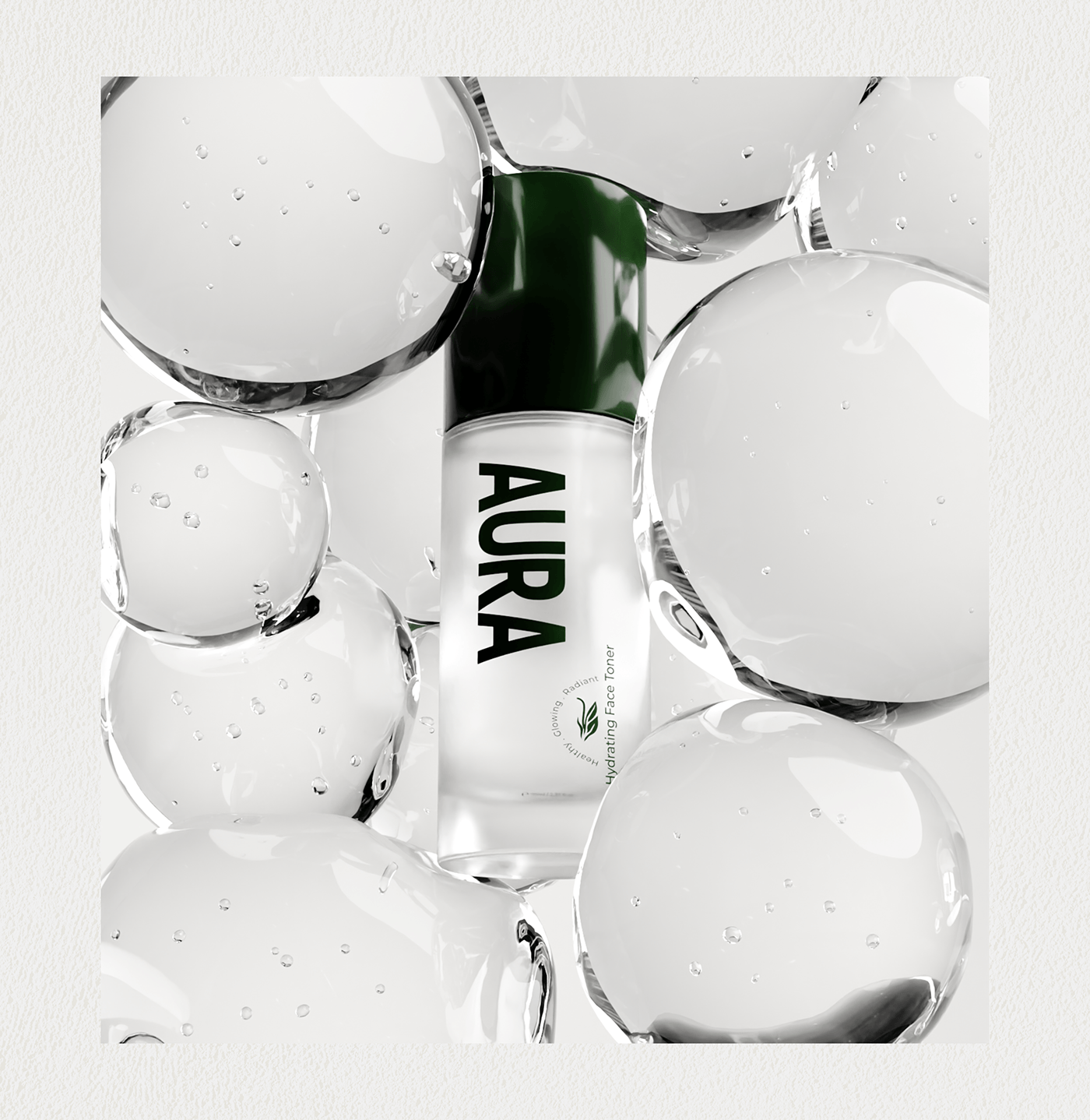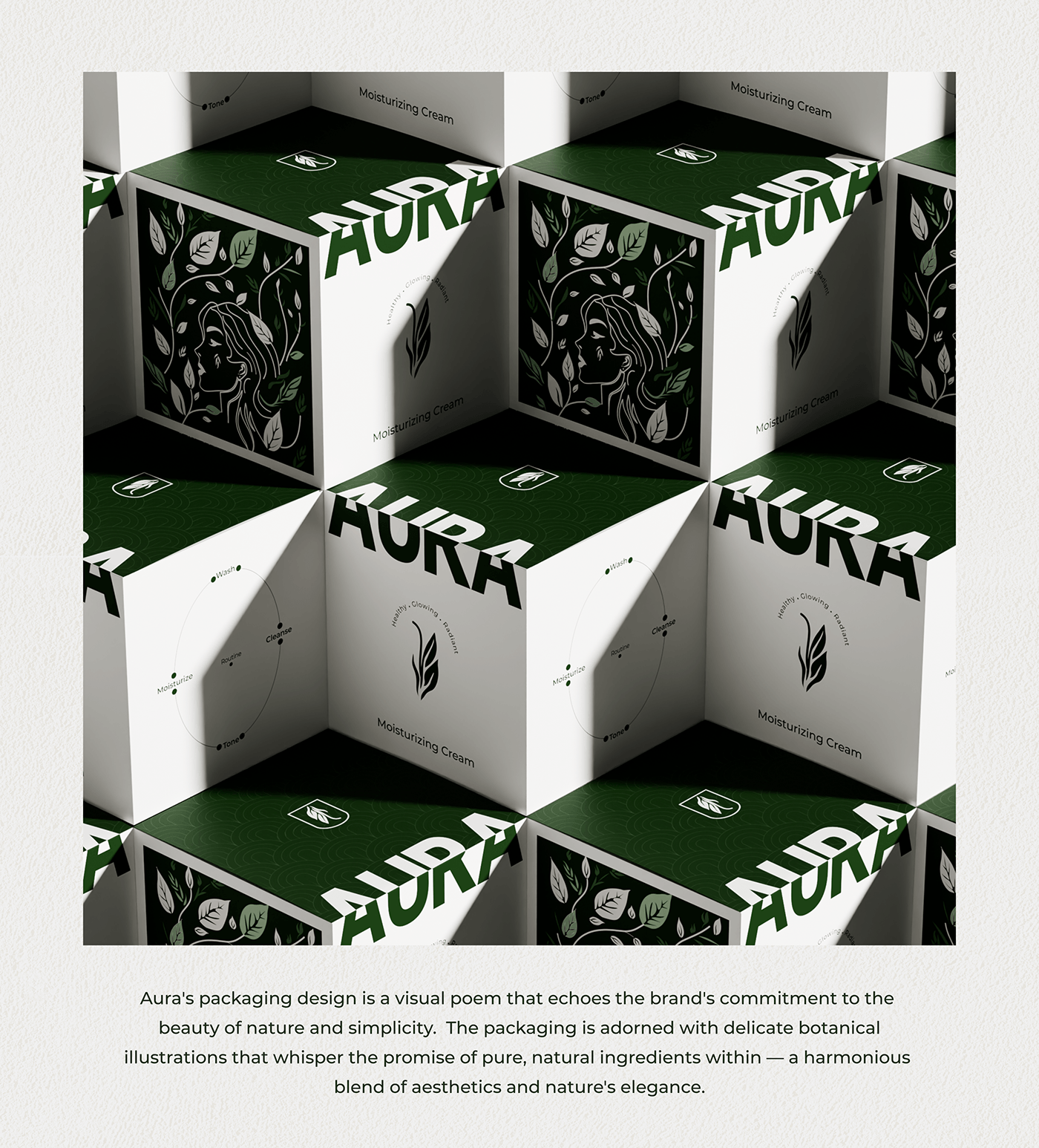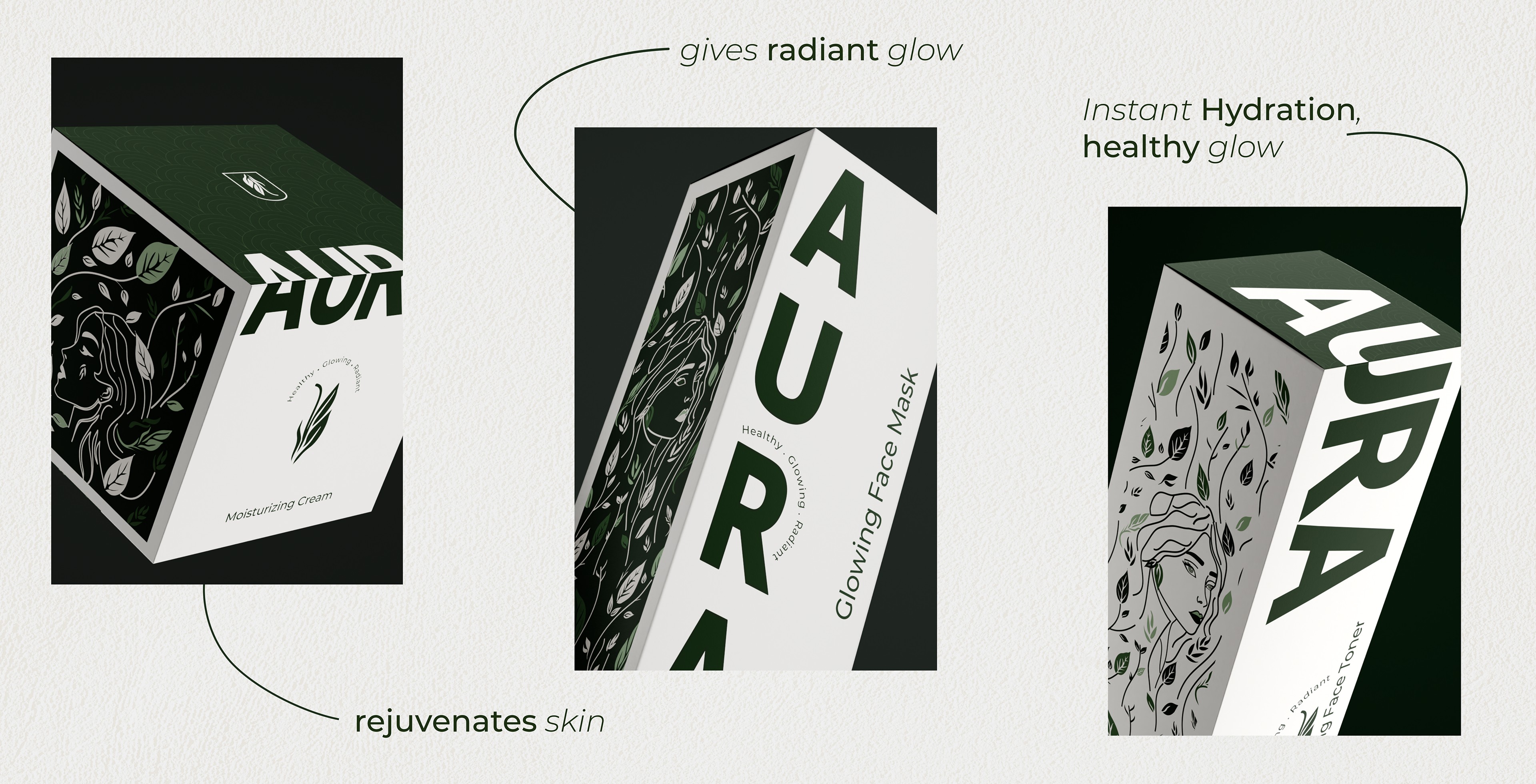 产品包装上的绿色植物图案线条简洁流畅,像是自然生长的藤蔓,充满了生机与活力。品牌名“AURA”以大写字母醒目地展示在包装上,字体简洁有力,给人一种专业、可靠的印象。而“Healthy · Glowing · Radiant”的字样则精准地传达了产品能够带给消费者的效果——健康、发光、容光焕发的肌肤。