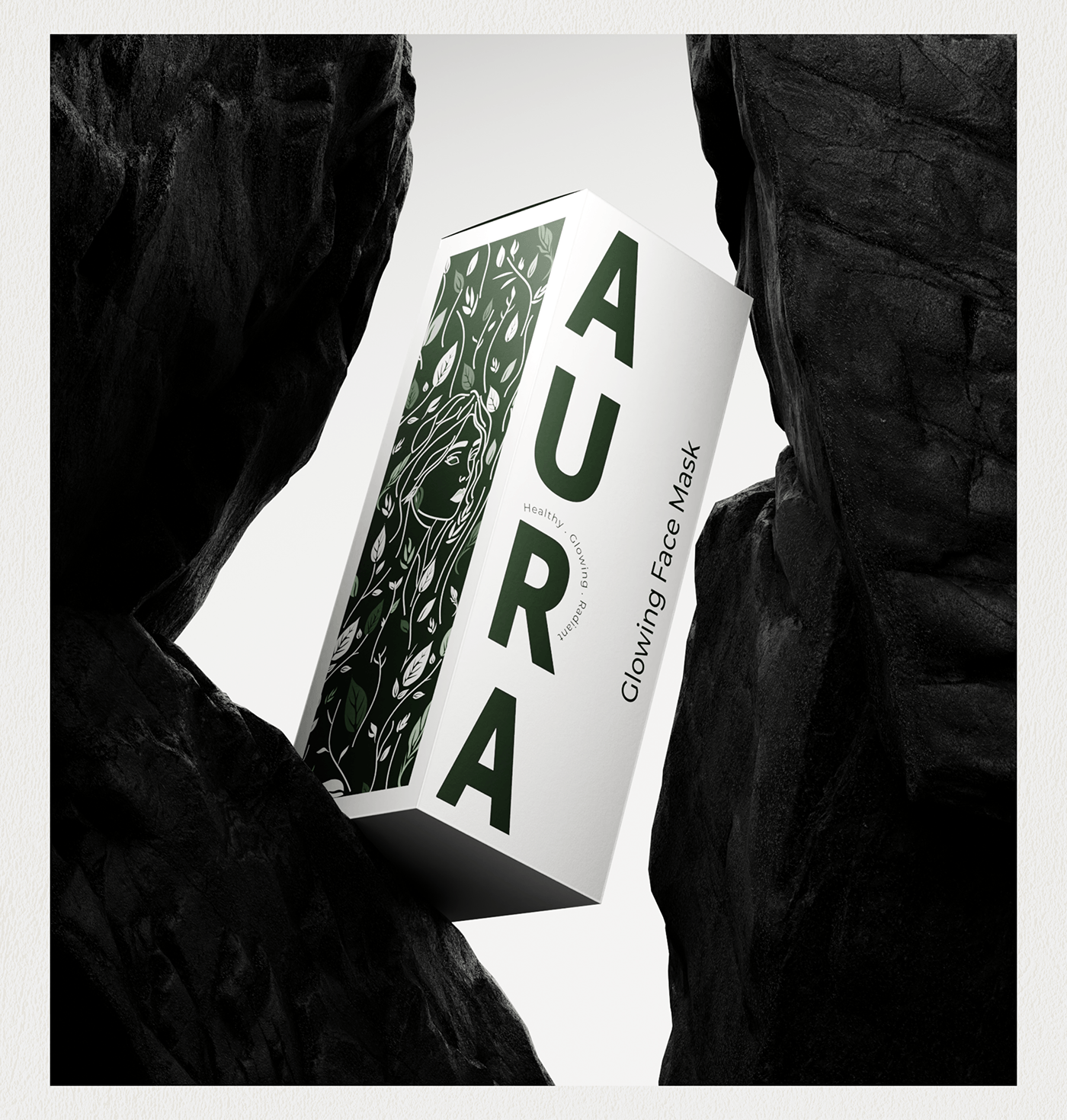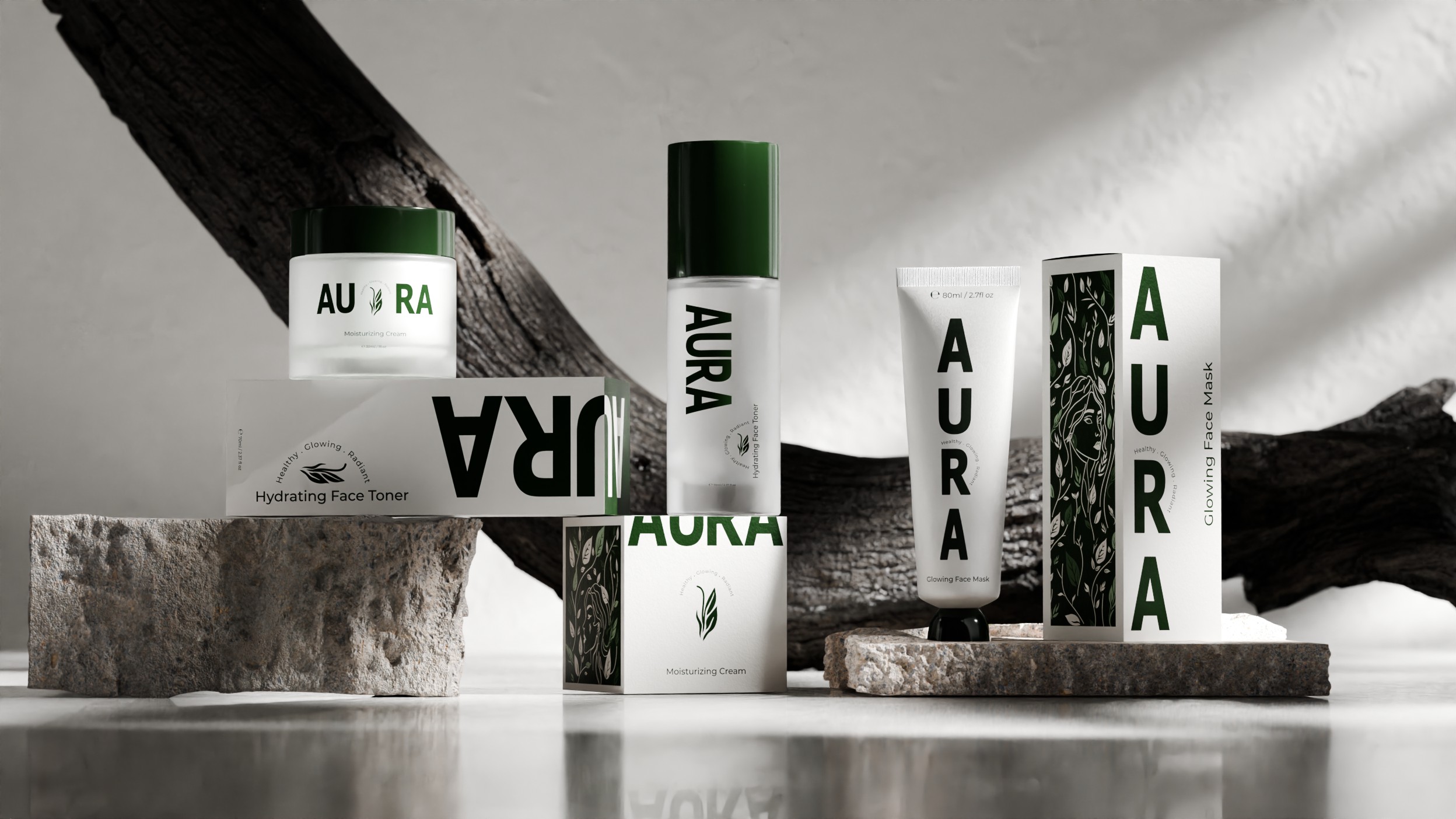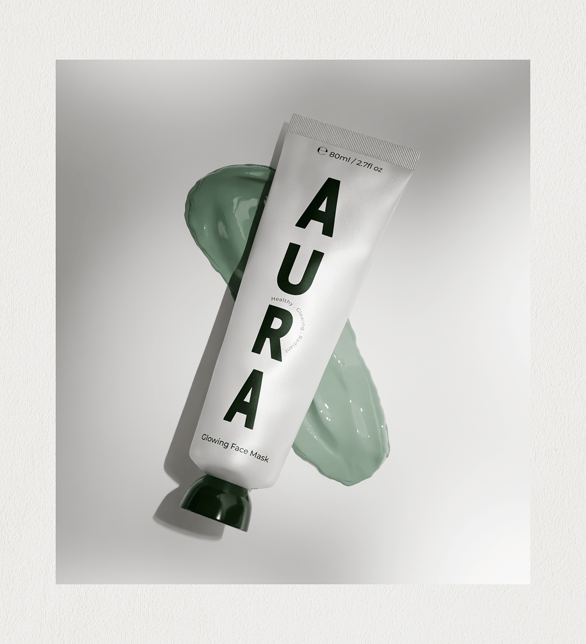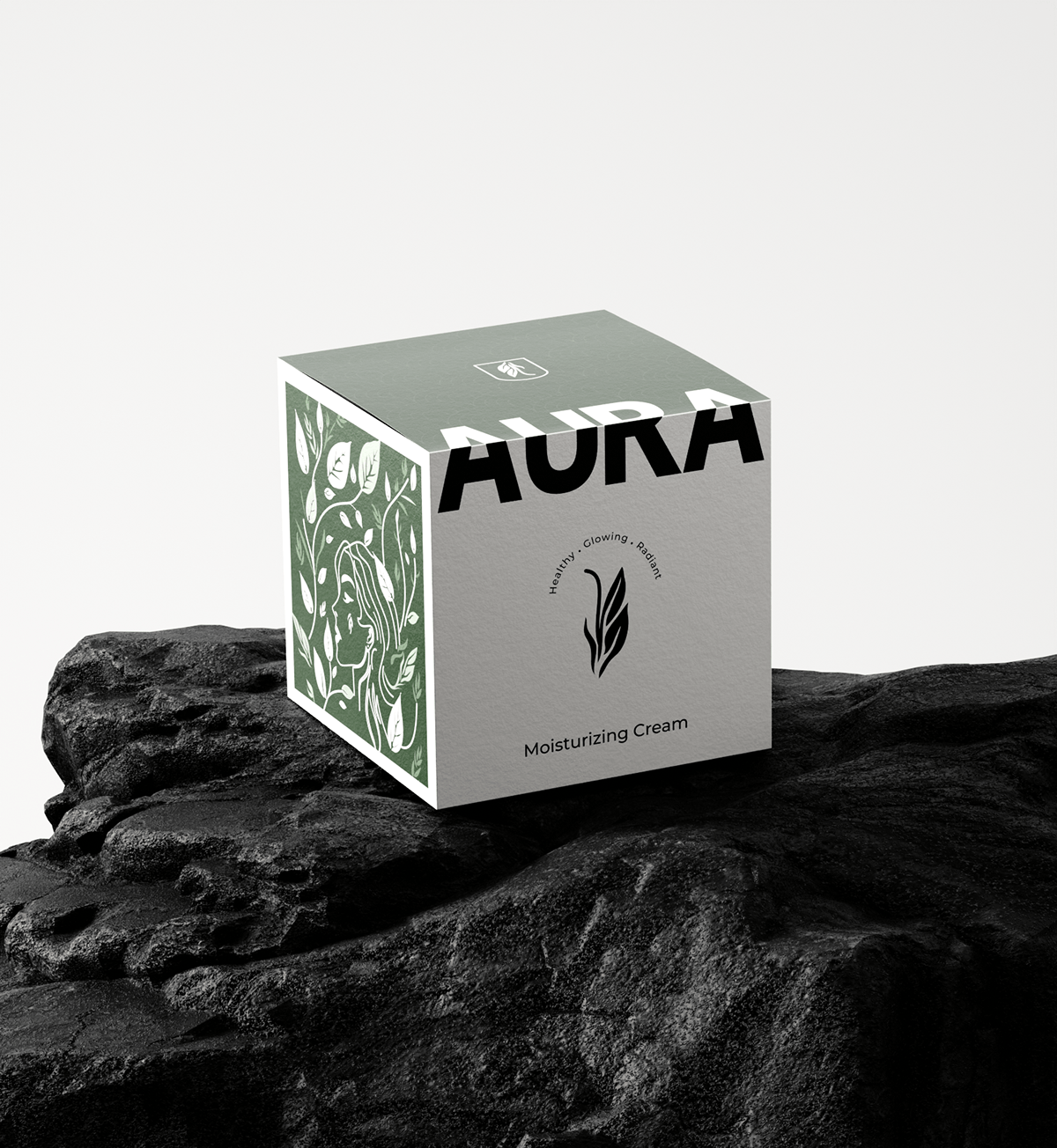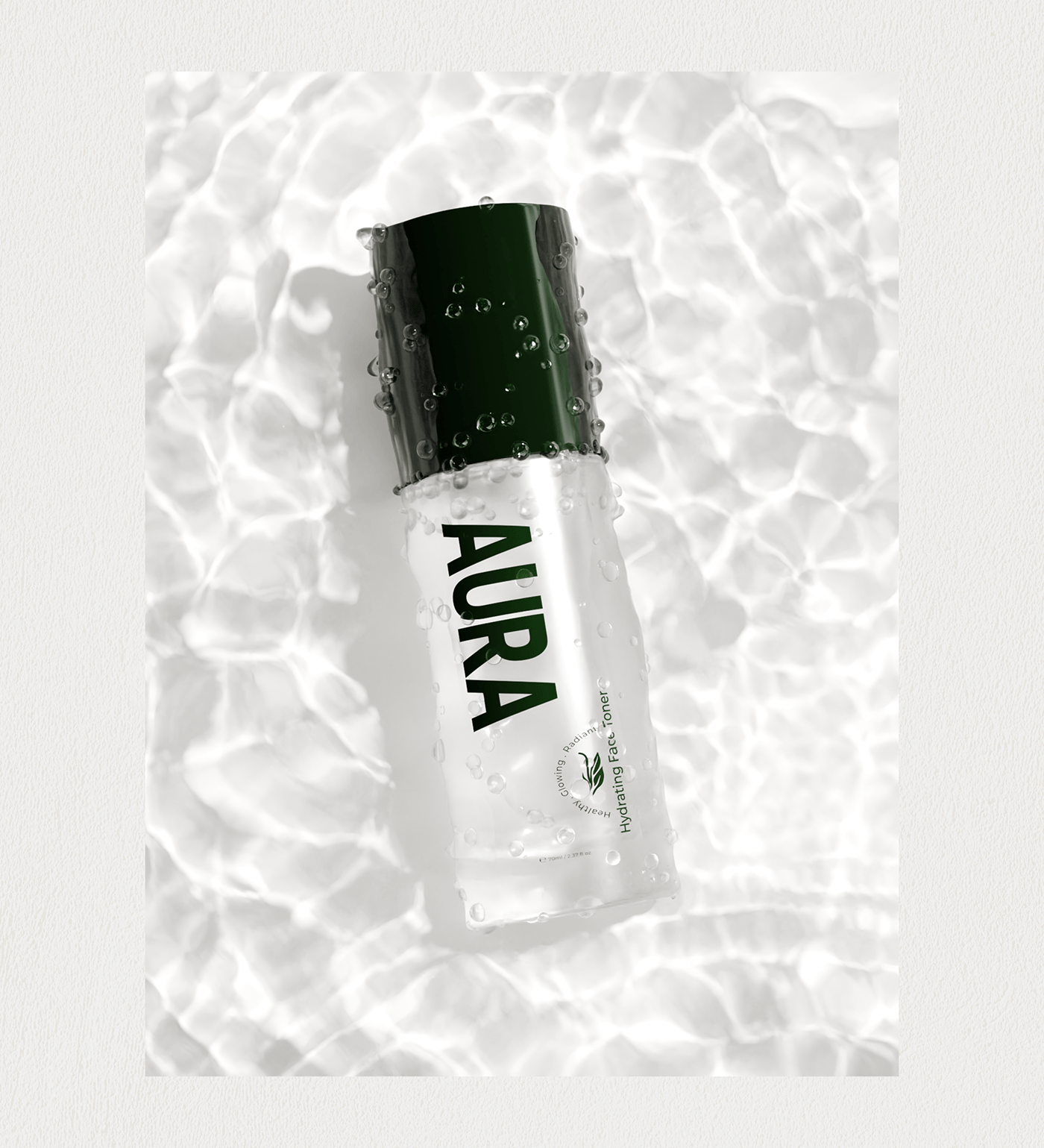 产品包装上的绿色植物图案线条简洁流畅,像是自然生长的藤蔓,充满了生机与活力。品牌名“AURA”以大写字母醒目地展示在包装上,字体简洁有力,给人一种专业、可靠的印象。而“Healthy · Glowing · Radiant”的字样则精准地传达了产品能够带给消费者的效果——健康、发光、容光焕发的肌肤。