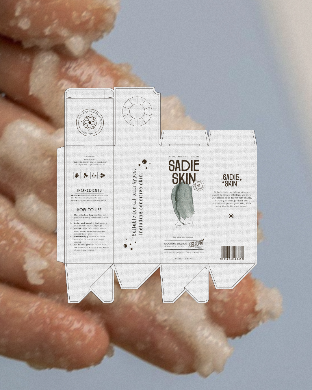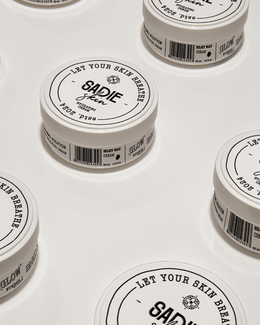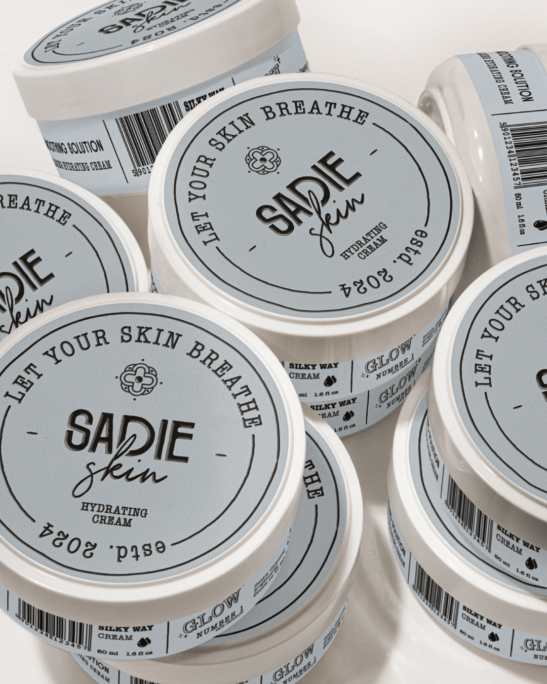 罐装产品的盖子顶部标签设计别具一格,“LET YOUR SKIN BREATHE”的字样不仅传达了产品让皮肤自由呼吸的理念,更像是一句贴心的护肤咒语。标签上的品牌名“SADIE skin”以手写风格呈现,多了几分随性与亲切,仿佛是品牌在与你轻声细语。