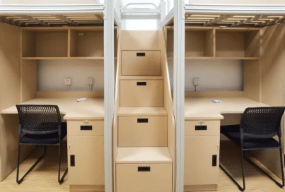 而在徐汇校区,由于地处城市核心,为标准四人间,部分为上床下桌,楼梯也可以收纳物品,配置与奉贤相似,同样配备空调、部分楼栋带有料理间。但与市中心的便捷配套环境一体化程度更高,步行15分钟即可直达地铁站,10分钟内覆盖各大书店、便利店、咖啡厅与社区运动空间。