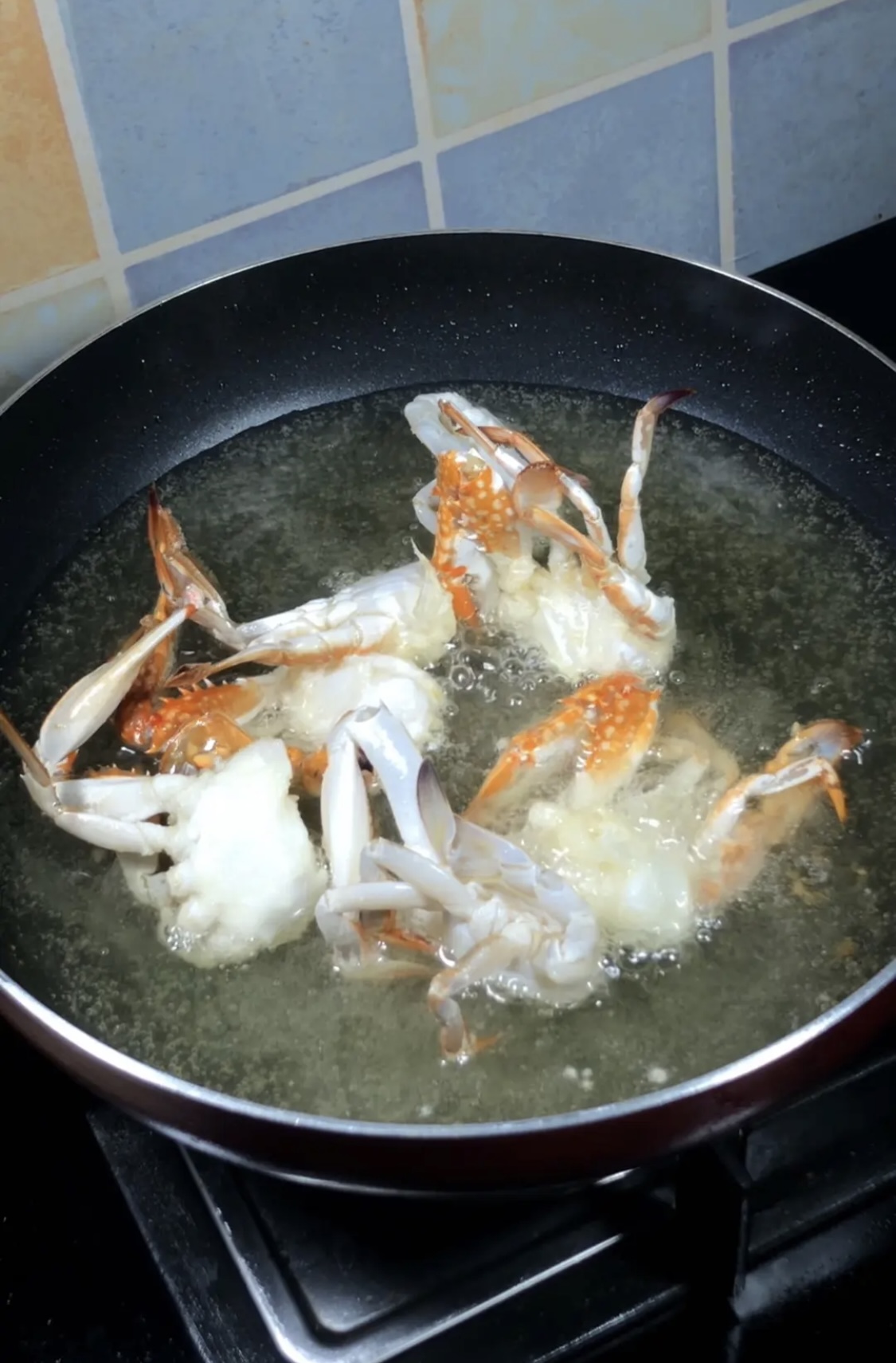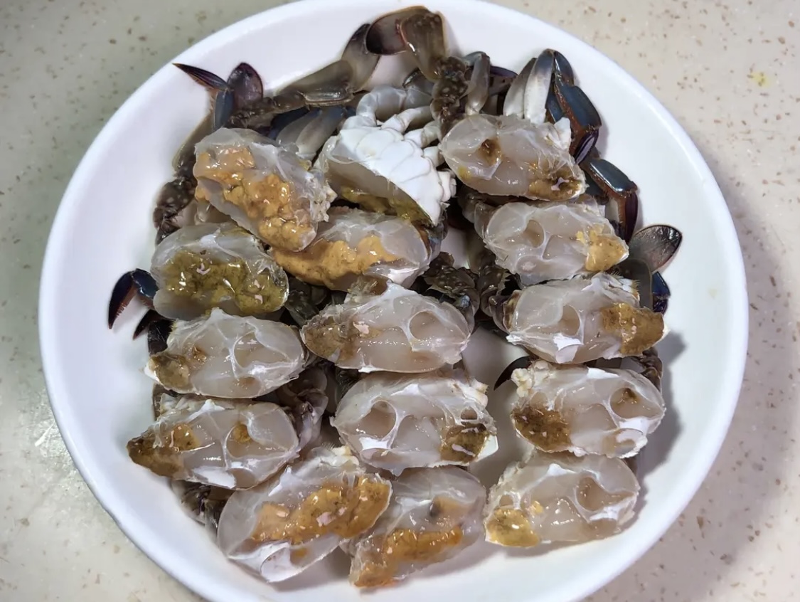 处理好的梭子蟹对半切开,切口处蘸点淀粉