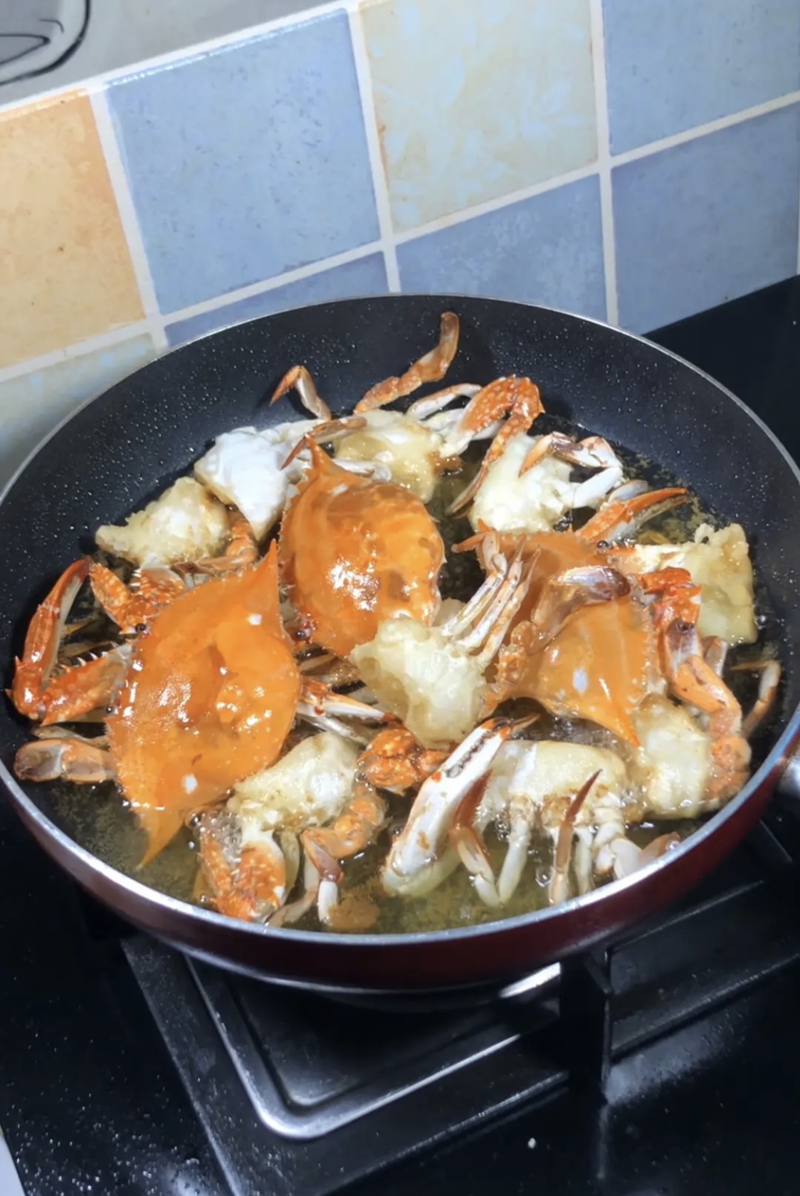 倒入蟹块翻炒均匀后沿着锅边淋入一圈料酒去腥