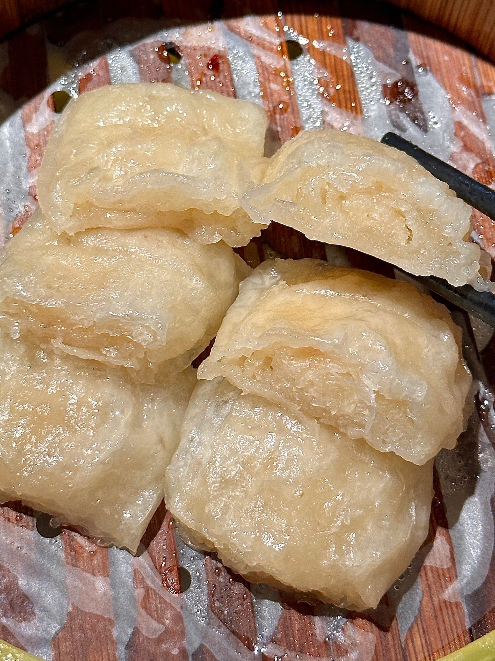 面皮薄如蝉翼,卷得匀实,蒸得透亮,