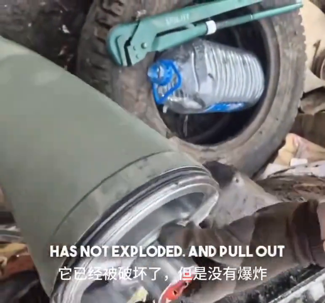 ·他们需要从弹体前方入手,这里需要先将火箭弹的前方弹头整流罩去下,这里面还有引信,因为是密封压上的,他们选择暴力拆解。这里可知他们将弹体中间弹药架弄断了,弹头也就可以直接掰下来。从这个角度可以看到内部的子弹药了。