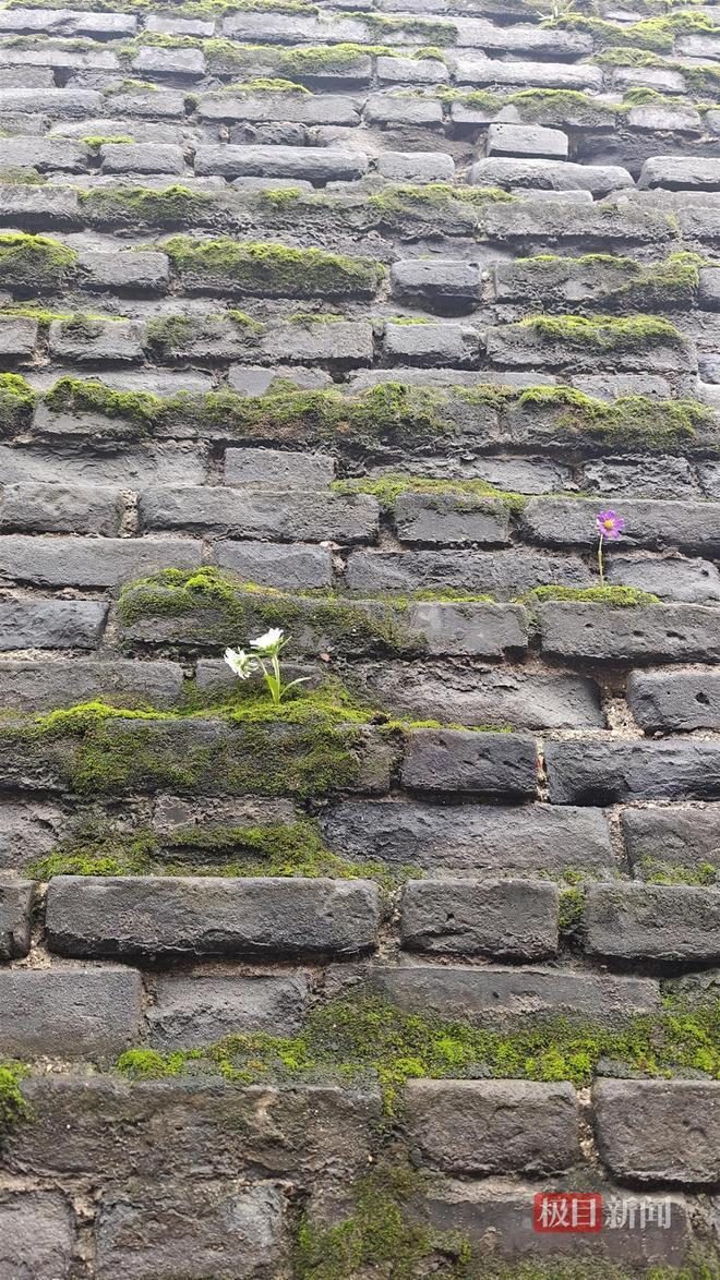 此外,西安城墙已因降雨长出了青苔,一些小花还从青苔上萌芽。记者在现场注意到,并非所有区域的城墙都有青苔,长青苔最多的城墙为土制,而现代修缮后的城墙则未长出青苔。
