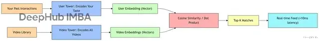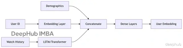 用户塔将观看历史、互动行为、时间上下文等信息压缩为 256 维向量,例如 [0.2, -0.7, ..., 0.4]。