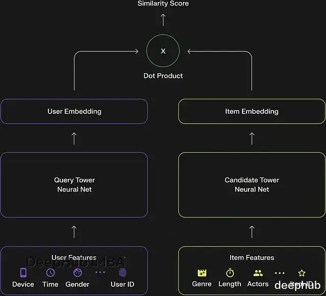 用户塔(User Tower)专门建模用户特征——偏好习惯、行为模式、上下文信息等等。物品塔(Item Tower)则负责理解内容特征——视频属性、创作者风格、话题标签等。