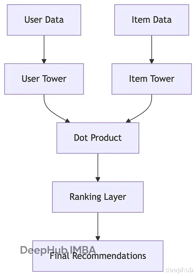 这种设计的巧妙之处在于将复杂的用户-内容匹配问题,转化为两个向量空间的相似度计算。