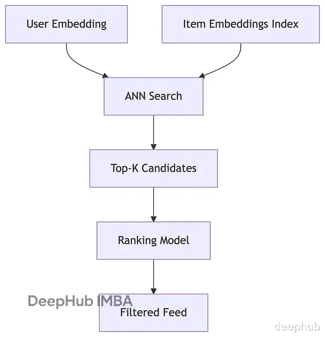 首先实时计算或获取用户的最新特征向量。接着通过 ANN 检索从全量视频库中召回几千个潜在候选。然后使用更复杂的排序模型对候选视频进行精排,考虑预期观看时长、互动概率等多个目标。