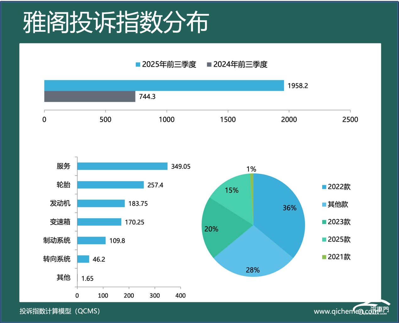 汽车质量投诉点评:2025年前三季度,雅阁的投诉指数为1958.2,同比上涨163.09%,悬架吃胎偏磨、变速箱故障灯亮成为车主投诉的主要原因。一位雅阁车主投诉称,该车行驶两万公里就出现了后轮偏磨严重现象,该车主让4S店检查,并让店内技师试驾,该店称是由于该车的悬架设计导致的轮胎偏磨。因当时该车的前胎花纹比较正常,该店为该车主把前胎换到后胎,但此后该车主行驶该车至1万公里后,后胎磨损又变得很严重。目前该车主诉求再次维修该车,但厂家至今并未给予回复。