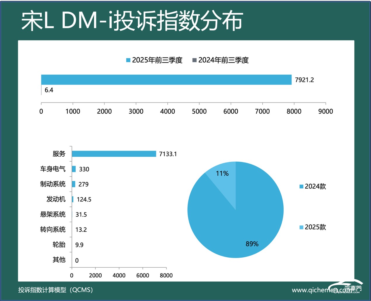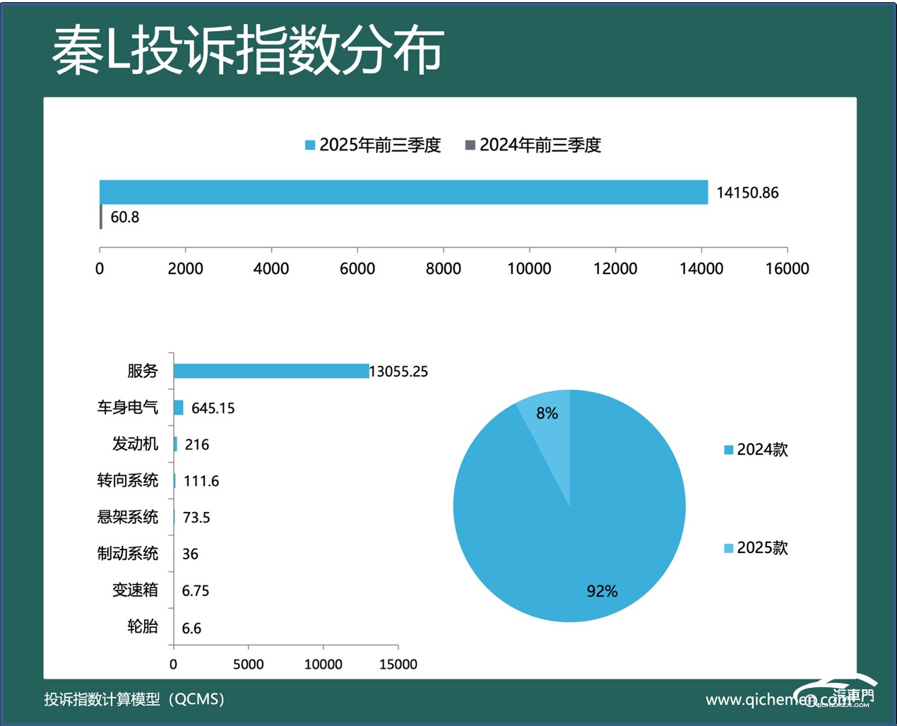 汽车质量投诉点评:2025年前三季度秦L的投诉指数为14150.85,同比暴涨23174.42%,新车降价增配成为车主集中投诉的主要原因。2024年5月28日,比亚迪官方正式发布秦L,仅过去不到一年的2025年3月23日,比亚迪官网王朝网推出了一款搭载“天神之眼”智驾系统的秦L新款车。大量秦L车主投诉称,老款车无法增配智驾系统,导致自家老款车大幅贬值,车主们的权益受到严重侵害。此外,秦L的续航里程虚标问题也收到了车主们的集中投诉。