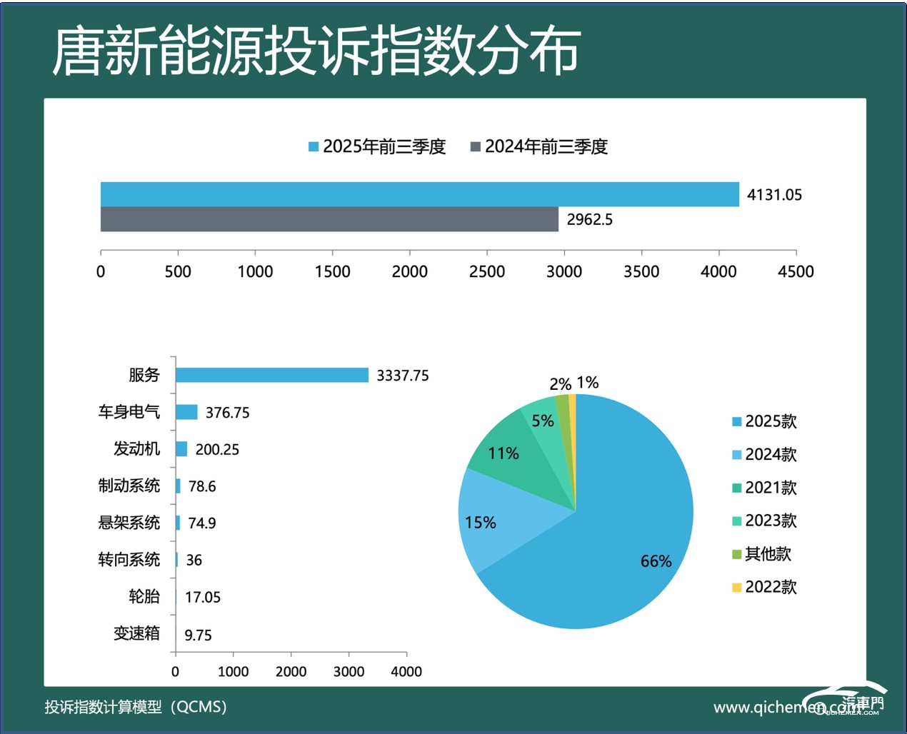 汽车质量投诉点评:2025年前三季度唐新能源的投诉指数为4131.05,同比上涨39.44%。该车收到投诉的车款主要集中在2025款。该车同样因新车降价增配问题遭到集中投诉。此外,发动机异常启动和配置与官宣不符也成为该车上榜的原因。一位唐新能源车主称,于2024年10月中旬购入该车的比亚迪官方认证精品二手车,在买车时该车主发现该车有异响,当时在现场请求解决,但工作人员让该车主先使用并观察一段时间,后来用车过程中该车主称该车的异响仍旧明显,随后到店检查,工作人员称该车方向机异响,但该车已过保让该车主自费处理。该车主不同意自费维修,目前该车主仍未与该店达成一致。