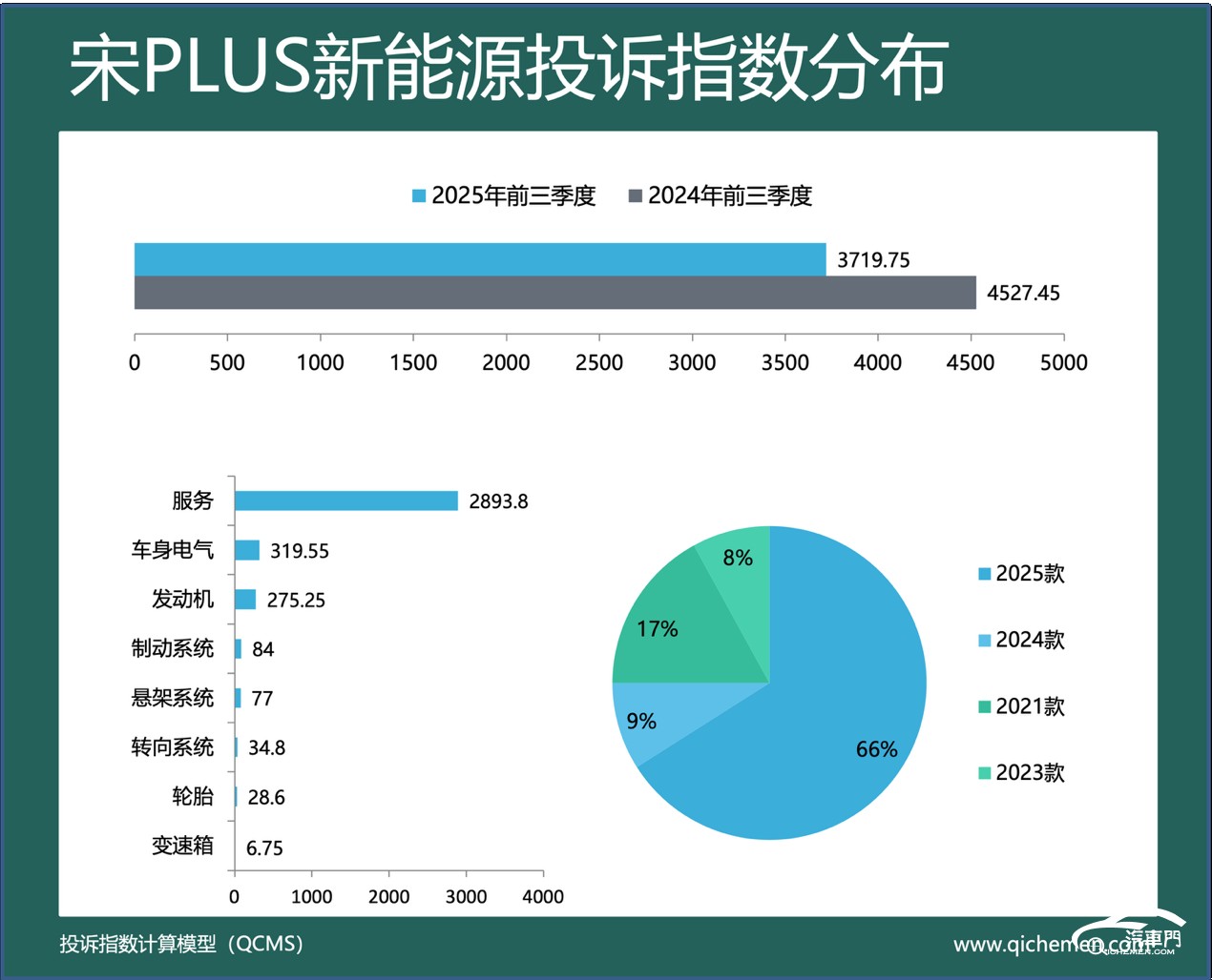 汽车质量投诉点评:2025年前三季度宋PLUS新能源的投诉指数为3719.75,同比下降17.84%。该车因新车降价增配、发动机异常启动和配置与官宣不符上榜。一位宋PLUS新能源车主称,因为油箱高低压问题,比亚迪官方在升级系统时,加入强制启动发动机的程序,在车主不知情情况下启动发动机。该车主称该情况已经持续了一年多,使用强制用电模式也无法关闭发动机。而至今比亚迪官方仍未给出任何解决措施。