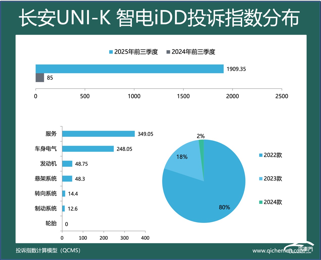 汽车质量投诉点评:长安UNI-K 智电iDD的2025年前三季度投诉指数为1909.35,同比上升2146.29%,变速箱顿挫异响和车机卡顿不升级等问题令该车饱受诟病。大量长安UNI-K 智电iDD车主投诉称,该车存在变速箱顿挫异响问题,并且该车的车机系统一直未升级,导航系统老旧导致驾车导航出现偏差,影响日常驾驶。长安汽车厂家回复称对于这些问题,公司高度重视,已安排工作人员联系处理,但究竟处理结果如何,并未受到厂商及车主的后续回复。