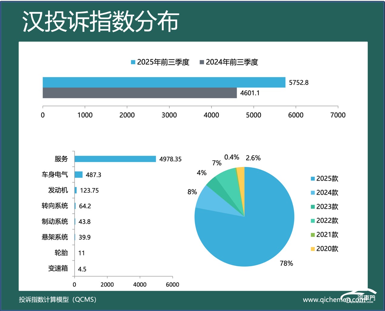 汽车质量投诉点评:汉的2025年前三季度的投诉指数为5752.8,同比增长25.03%。上榜理由依然是比亚迪旗下车型通病,新车降价增配和续航里程不准的问题。一位比亚迪汉 DM-i车主投诉称,他于2024年10月订车,并于一个月后提车。2025年2月10日,比亚迪官方推出了该车的“智能驾驶升级版”,使该车主刚买不久的车在二手市场大幅贬值,经多家平台评估,贬值幅度达12%-15%,导致该车主承受了经济损失。该车主诉求官方对自家车进行免费硬件升级和补偿贬值差额等措施维护自身权益。