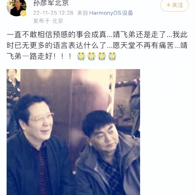 他的“大哥”孙彦军发文哀悼:靖飞弟还是离开了,从来不敢相信预感会是真的...
