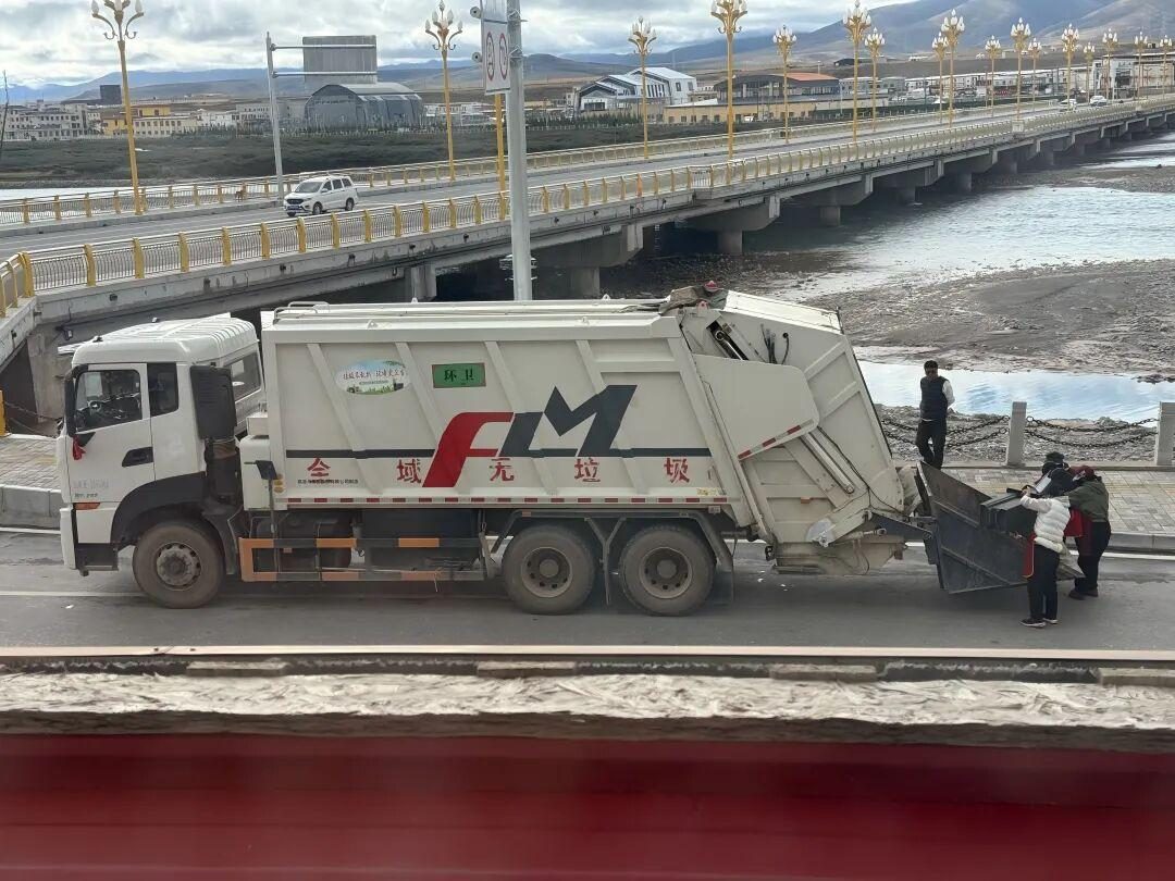 9月20日10时许,一辆载重25吨的压缩垃圾车驶过治多县主街道,居民听到熟悉的《兰花草》旋律,纷纷出来倒垃圾。新京报记者 丛之翔 摄