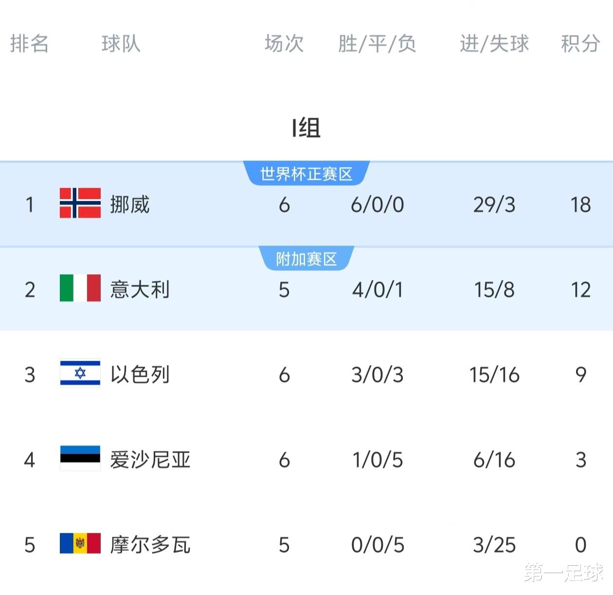 最新积分榜上,挪威队六战全胜积18分排名第一,净胜球也多达26个,首轮主场3比0完胜意大利队。意大利队在少赛一轮的情况下,积12分排名第二,净胜球只有7个。
