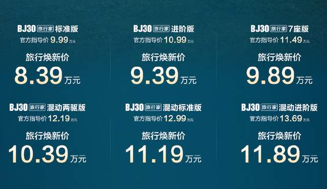 先看价格,这台北京越野 BJ30 旅行家,定位 “10 万级超大空间轻越野 SUV”,燃油 + 混动一共 6 款车,官方指导价 9.99-13.69 万。重点是!焕新价最低 8.39 万就能拿下!