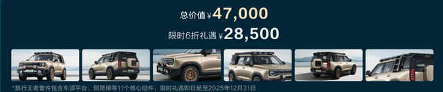 哦,对了!这次BJ30旅行家还给到了大家一套旅行王者套件,对于喜欢改装的玩家!拼手速了要!原厂三件套6折即可拥有:行李架,侧爬梯,小书包!这个小书包还带电子屏哦,后面要出现什么内容,你自己说了算!有了这三件套,颜值立刻拉满!