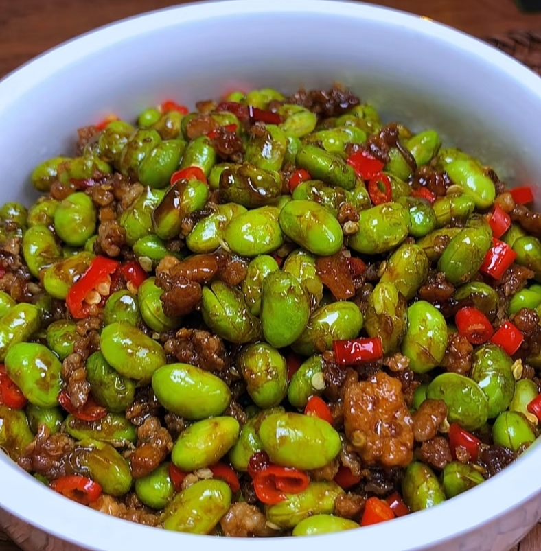 转大火,先下毛豆翻炒30秒,再倒入肉丝,加1勺生抽、半勺白糖提鲜,快速翻炒均匀。最后沿锅边淋入2勺泡梅干菜的水,盖盖焖1分钟,让毛豆和肉丝吸饱梅干菜的汤汁。
