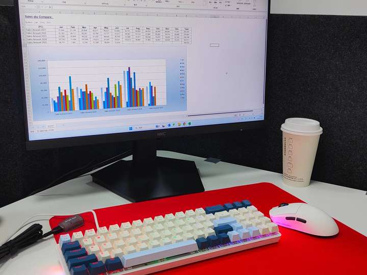 经典白配色,素颜是雾面质感像磨砂陶瓷,不沾指纹不吸灰,摆在办公桌上跟白色桌面融合在一起。关键还耐脏,污渍、灰尘用湿纸巾一擦就干净,打理非常简单方便。
