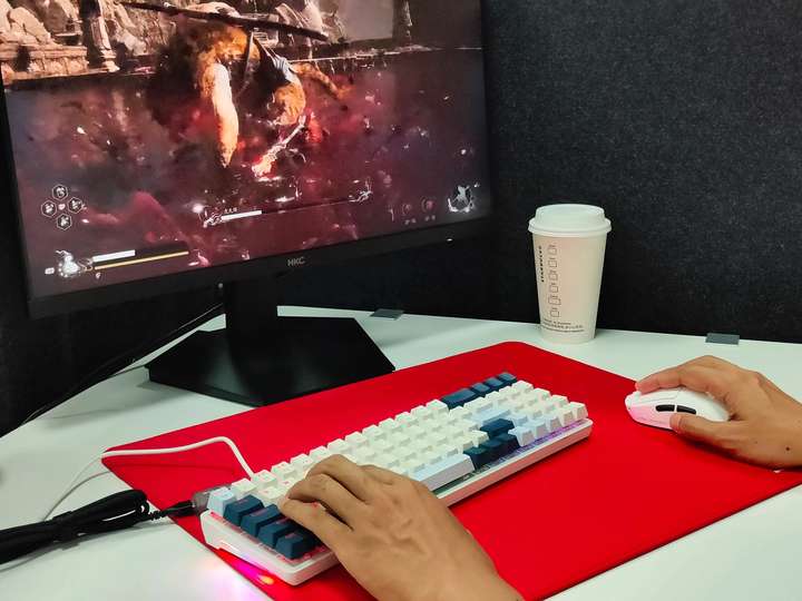 模具细节优化很贴心:滚轮高度微提 1 毫米,之前滚文档指节总酸,现在手指自然搭着就顺手;右侧新增下凹设计,敲两小时表格也不紧绷。周末玩《黑悟空》连玩三小时,手腕依然没之前那种酸胀感,轻量化是做得真香!